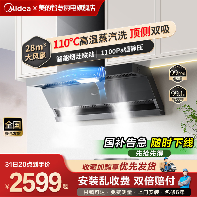 美的抽油烟机家用蒸汽洗智能挥手厨房大吸力顶侧双吸免拆洗吸烟机