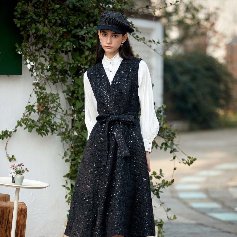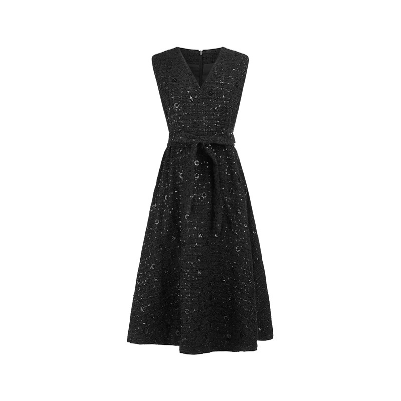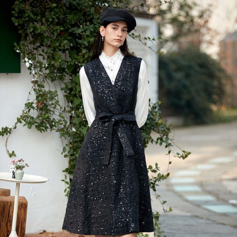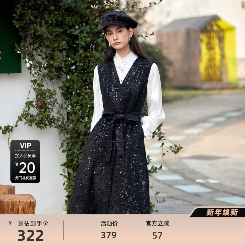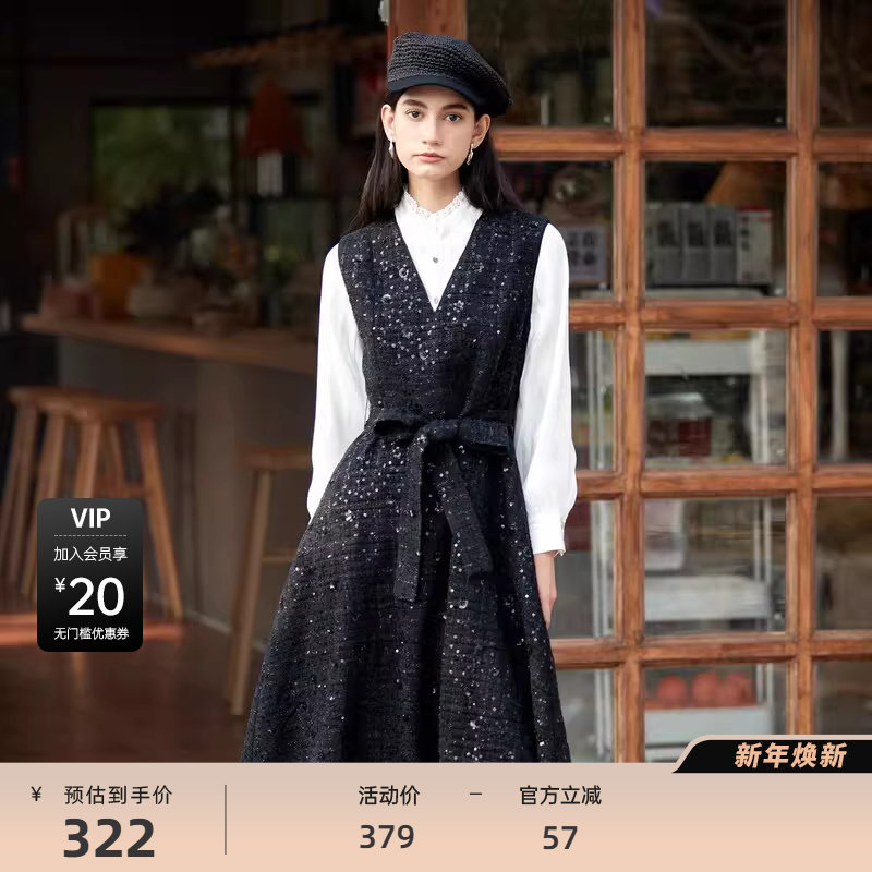 sdeer圣迪奥女装小香风套装V领格纹无袖连衣裙S23461203