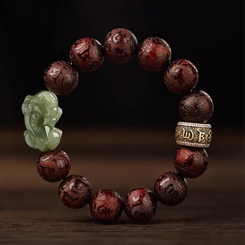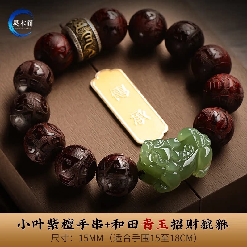 印度小叶紫檀手串男士招财和田玉貔貅雕刻六字真言佛珠本命年手链