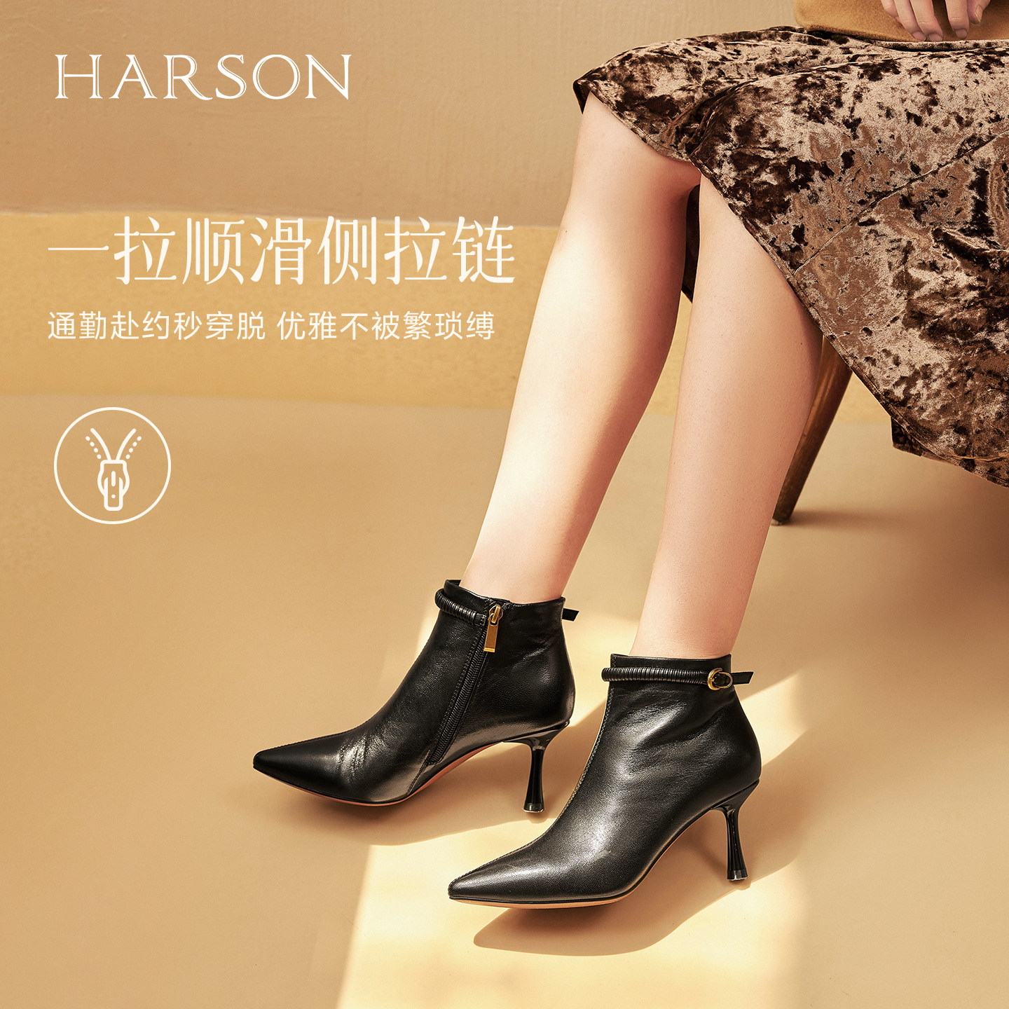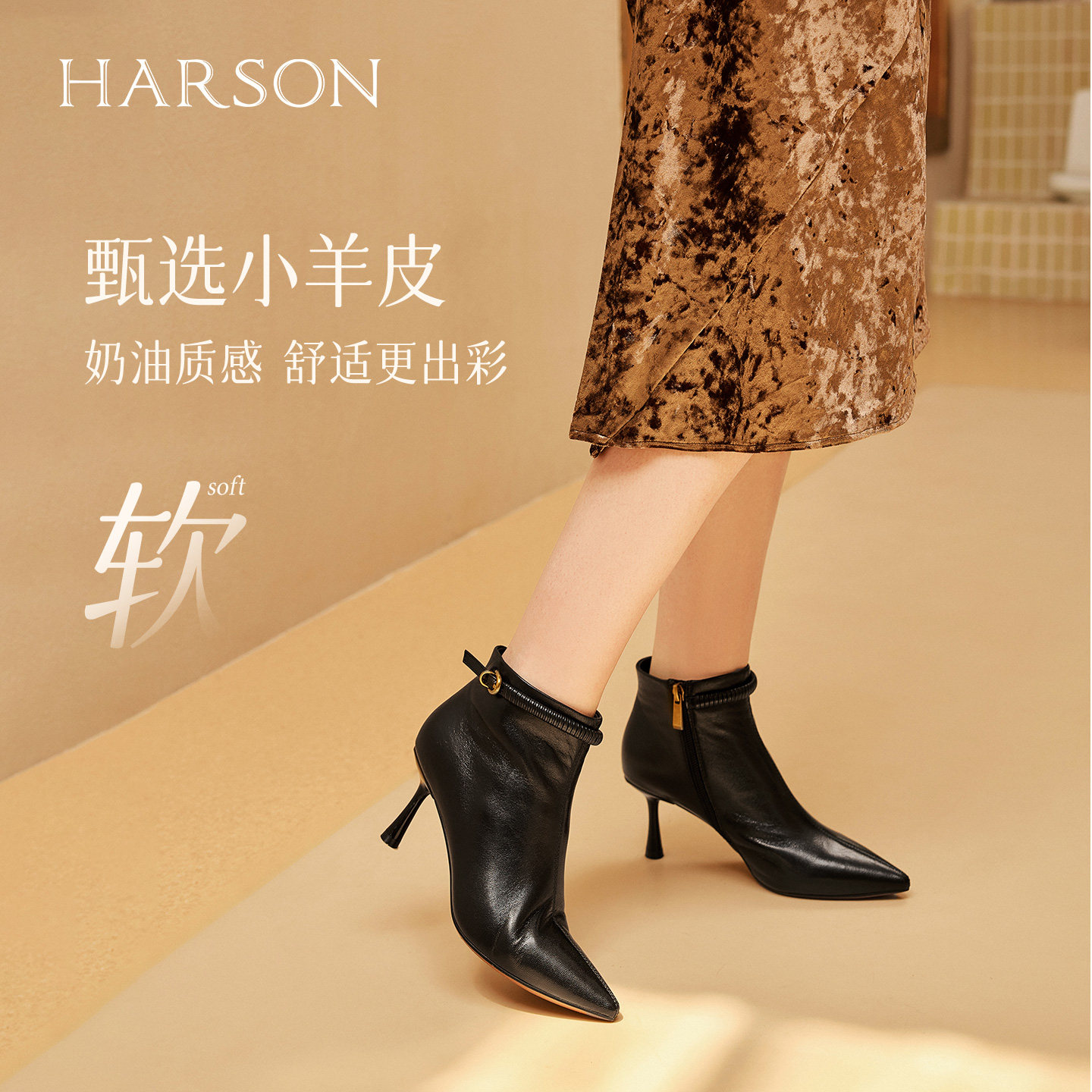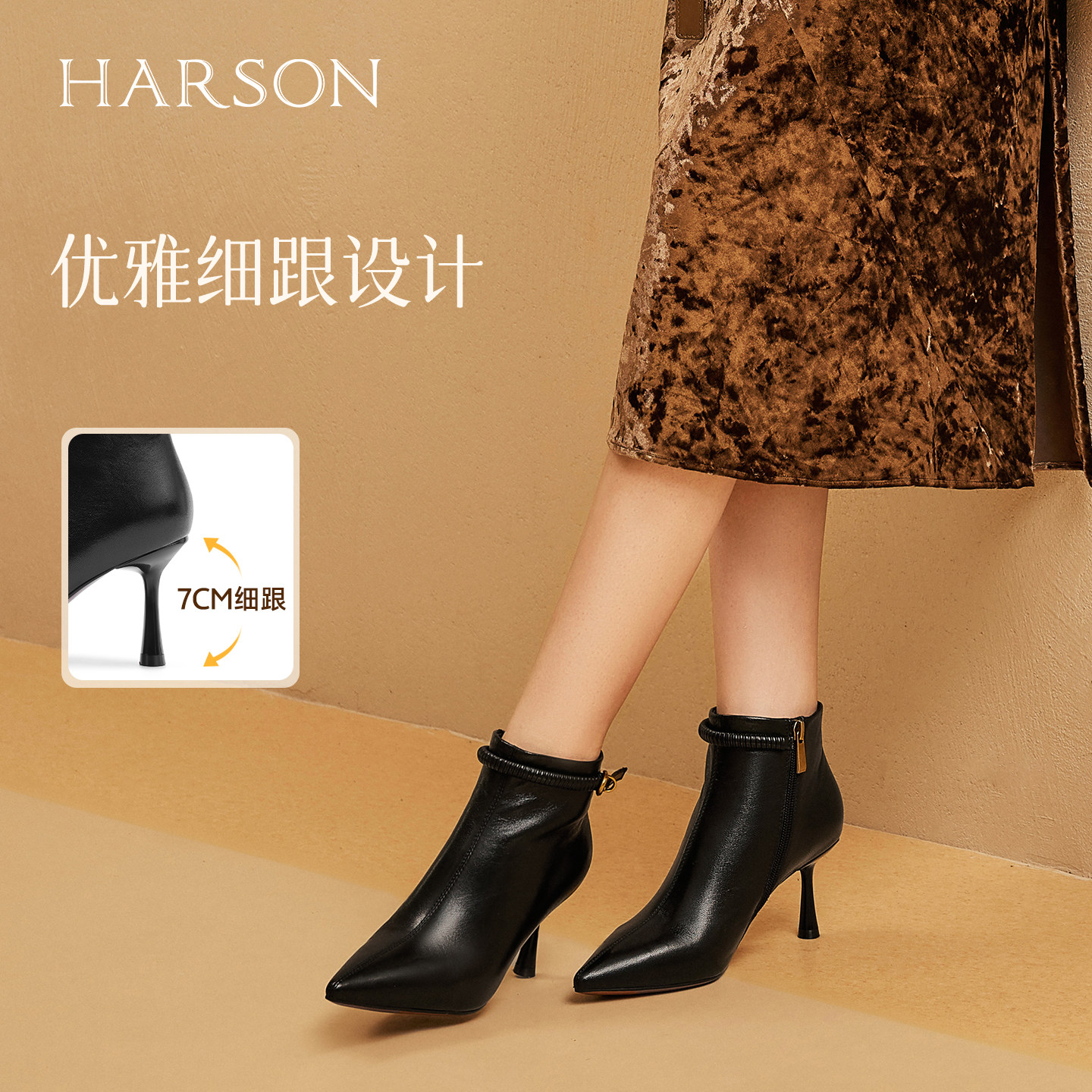 哈森/HARSON【黑金定律】25秋冬新款真皮气质尖头高跟时装短靴女