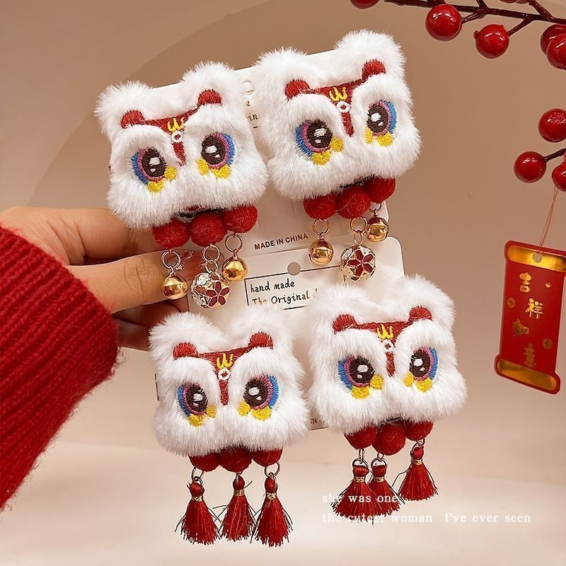 2025新年醒狮流苏发夹过年儿童红色发饰毛绒可爱卡通发卡头饰抓夹