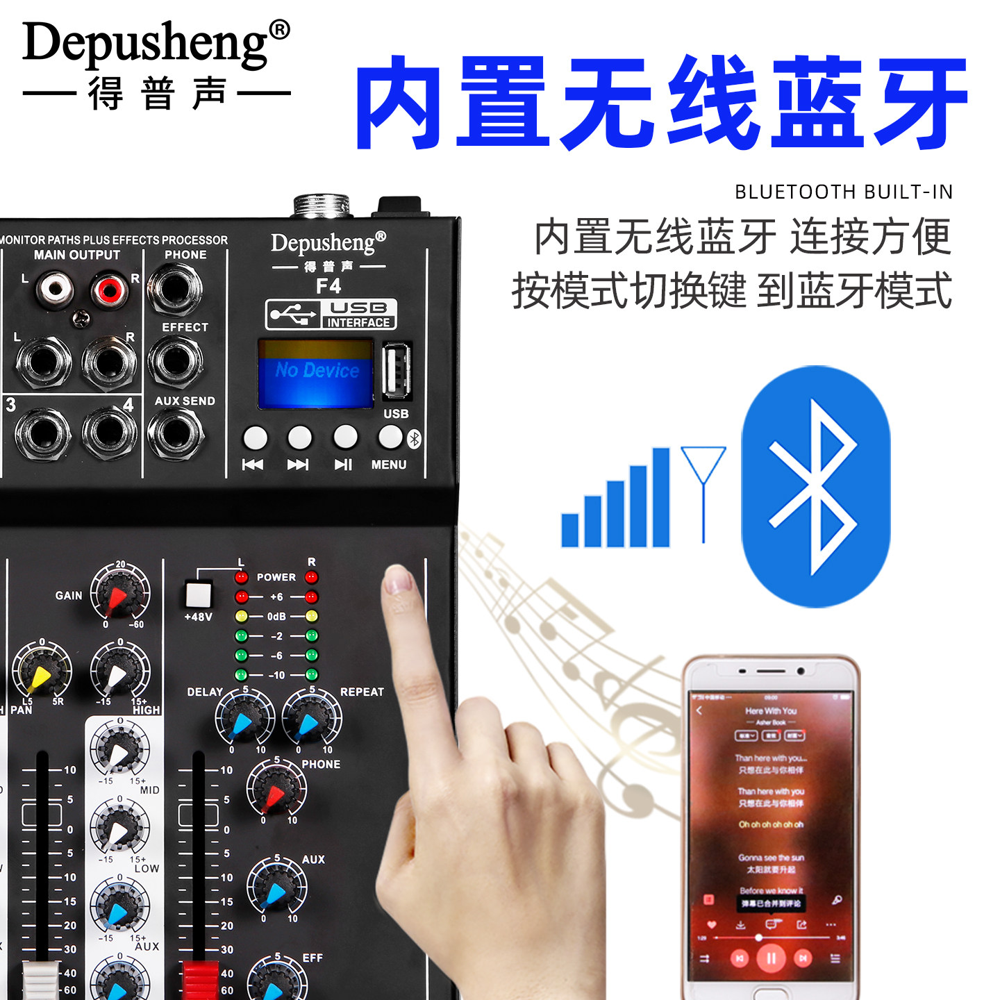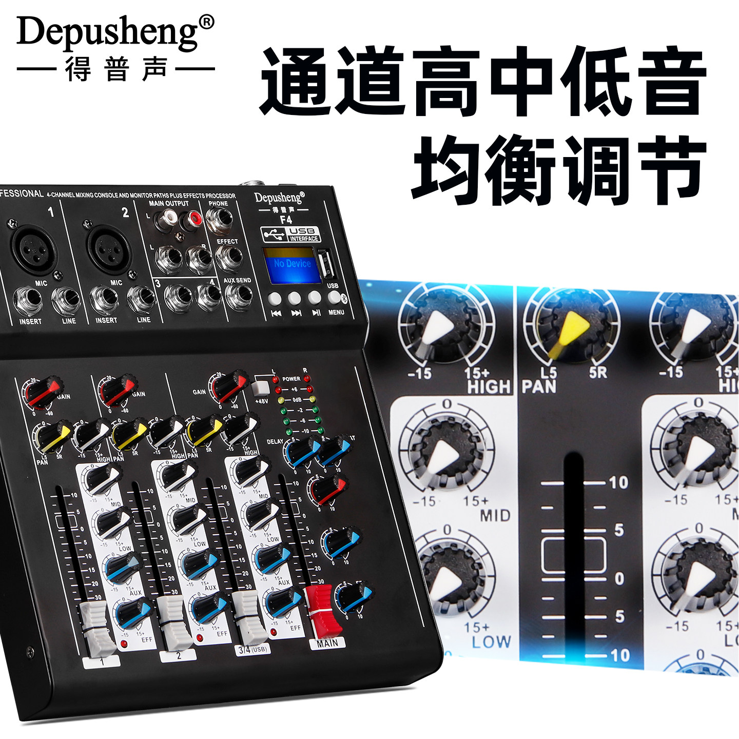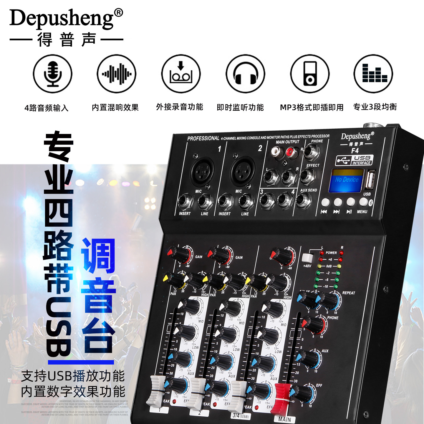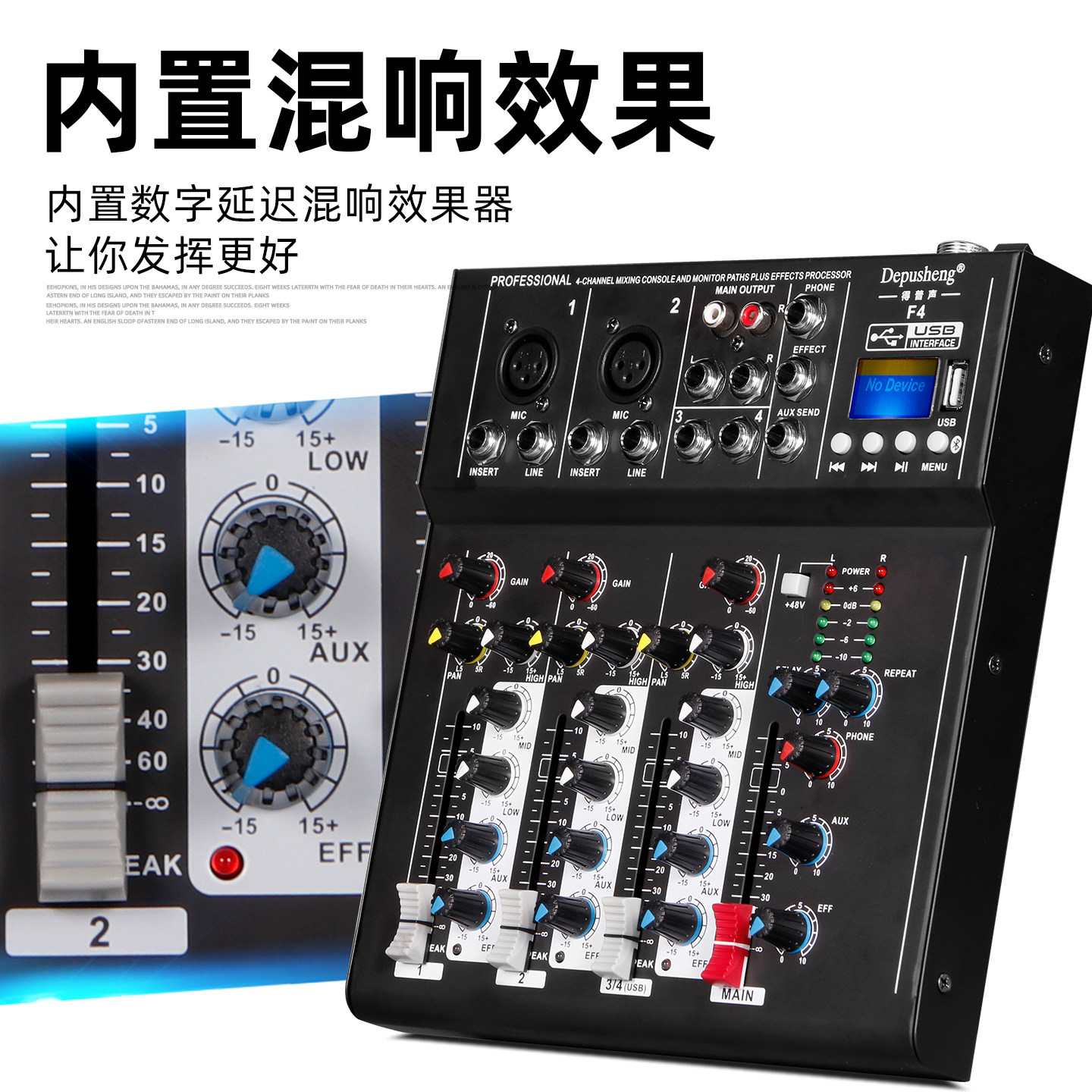得普声F4专业4路调音台电脑录音K歌直播小型家用混响效果蓝牙乐队