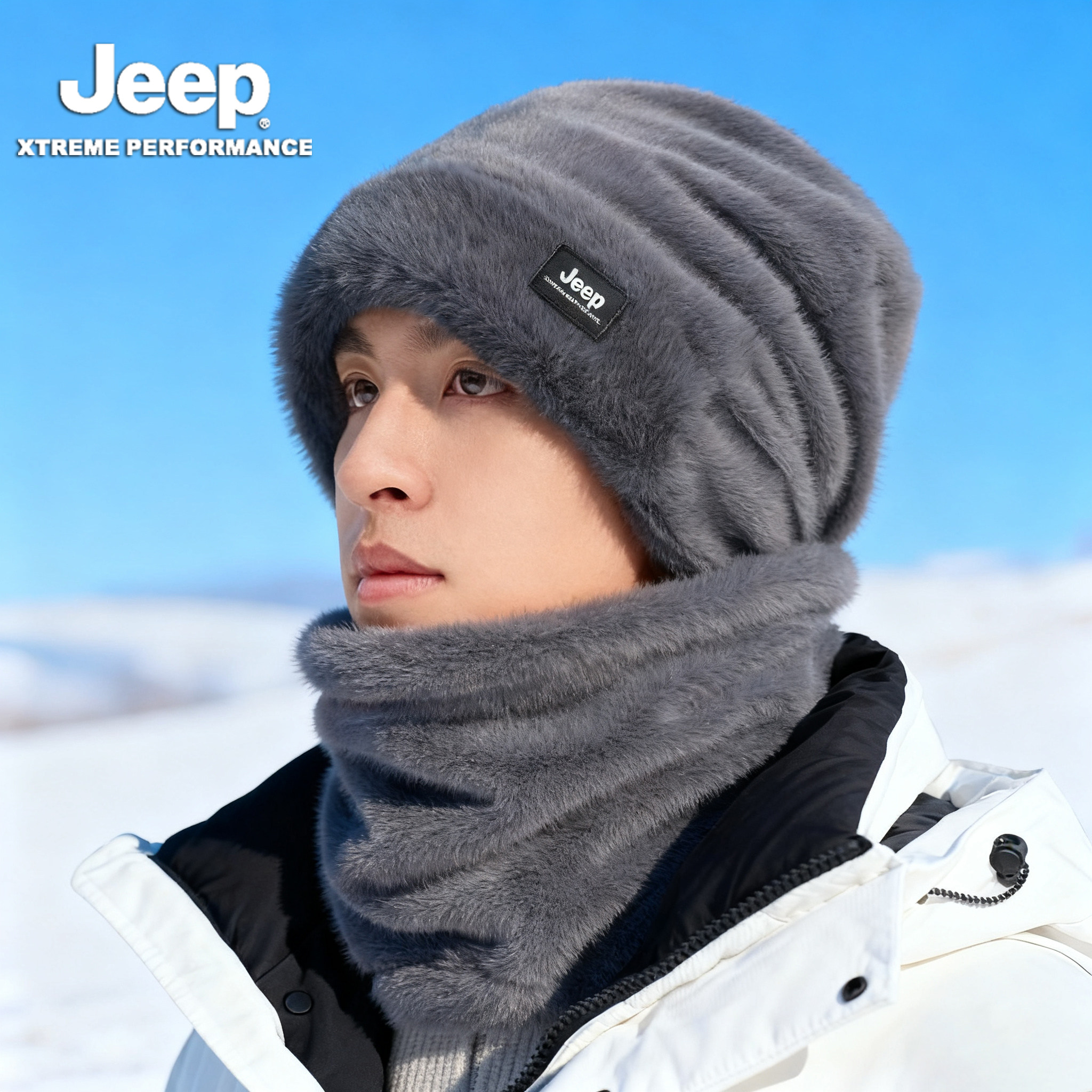 JEEP吉普套头帽子男士2025新款冬季加绒保暖护耳护颈围脖套装男款