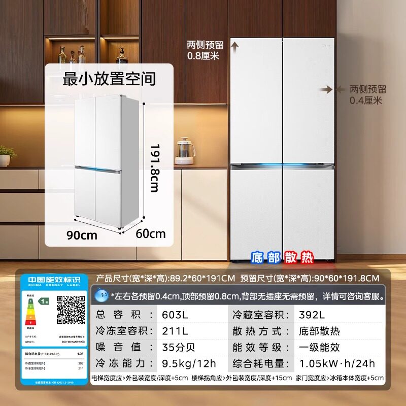 【全国补贴】美的熊墩墩603L冰箱以旧换新零嵌十字四门家用大容量