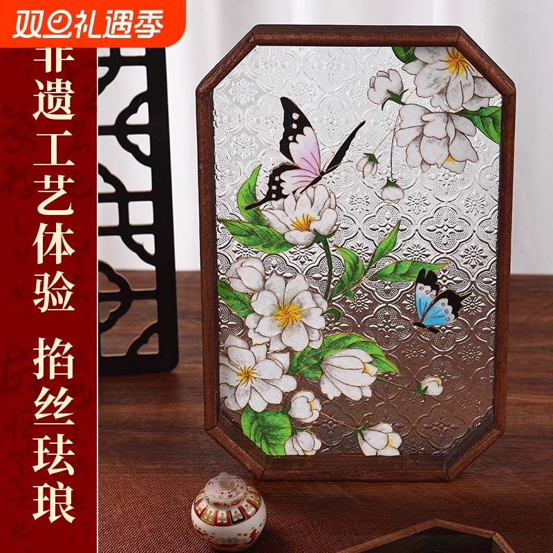 压花珐琅木质DIY手工材料掐丝玻璃茶托盘非遗景泰蓝礼物茶盘蝴蝶