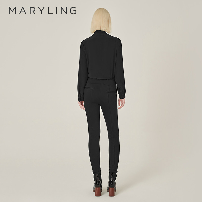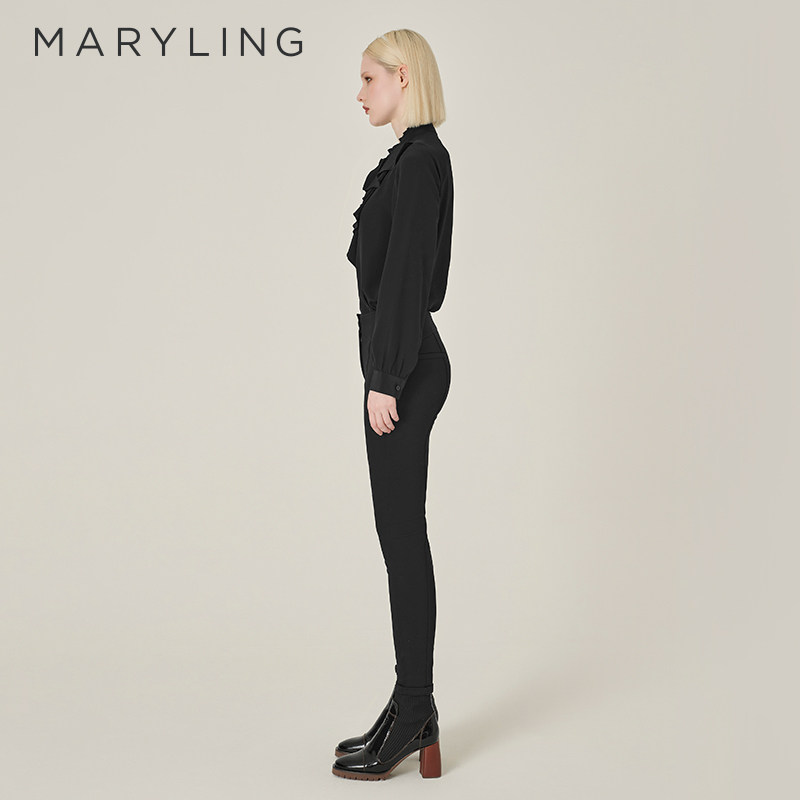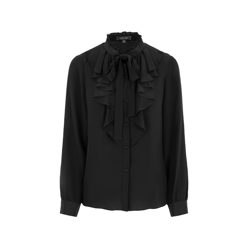 MARYLING玛俪琳初冬新品黑色荷叶边飘带真丝衬衣A1EHW20140