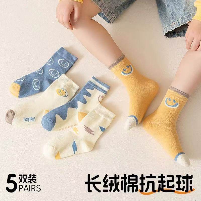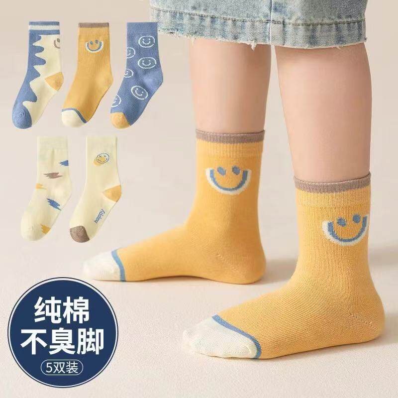 儿童袜子男春秋季防臭男童袜宝宝纯色棉袜无骨中筒袜男孩笑脸长袜