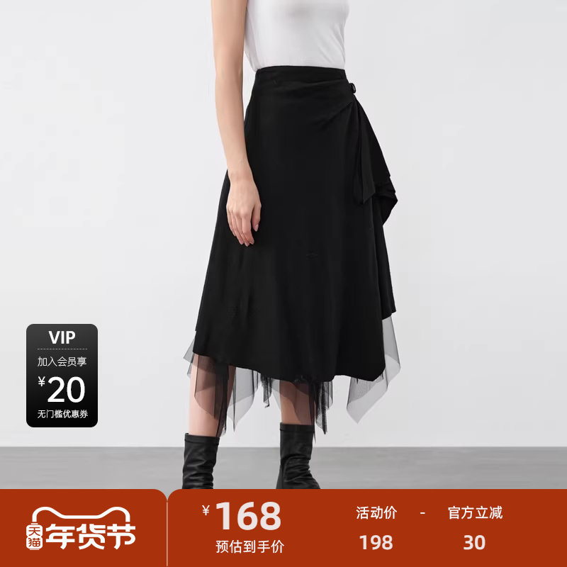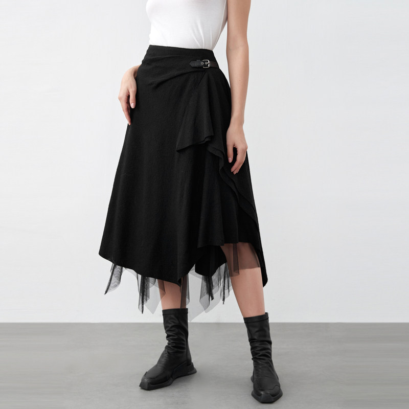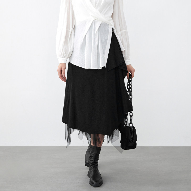 sdeer圣迪奥女装优雅网纱拼接不规则毛呢A字长裙S21481104