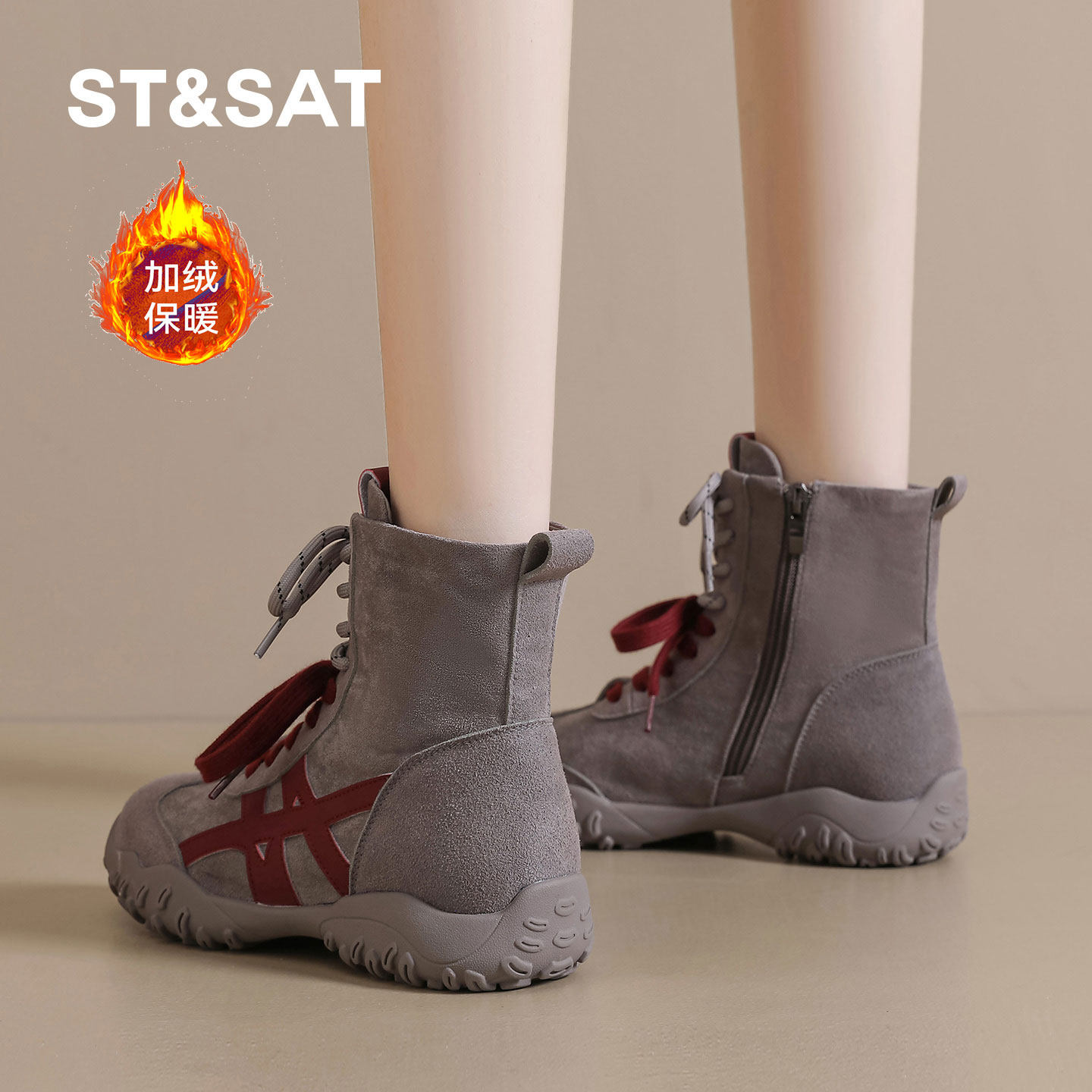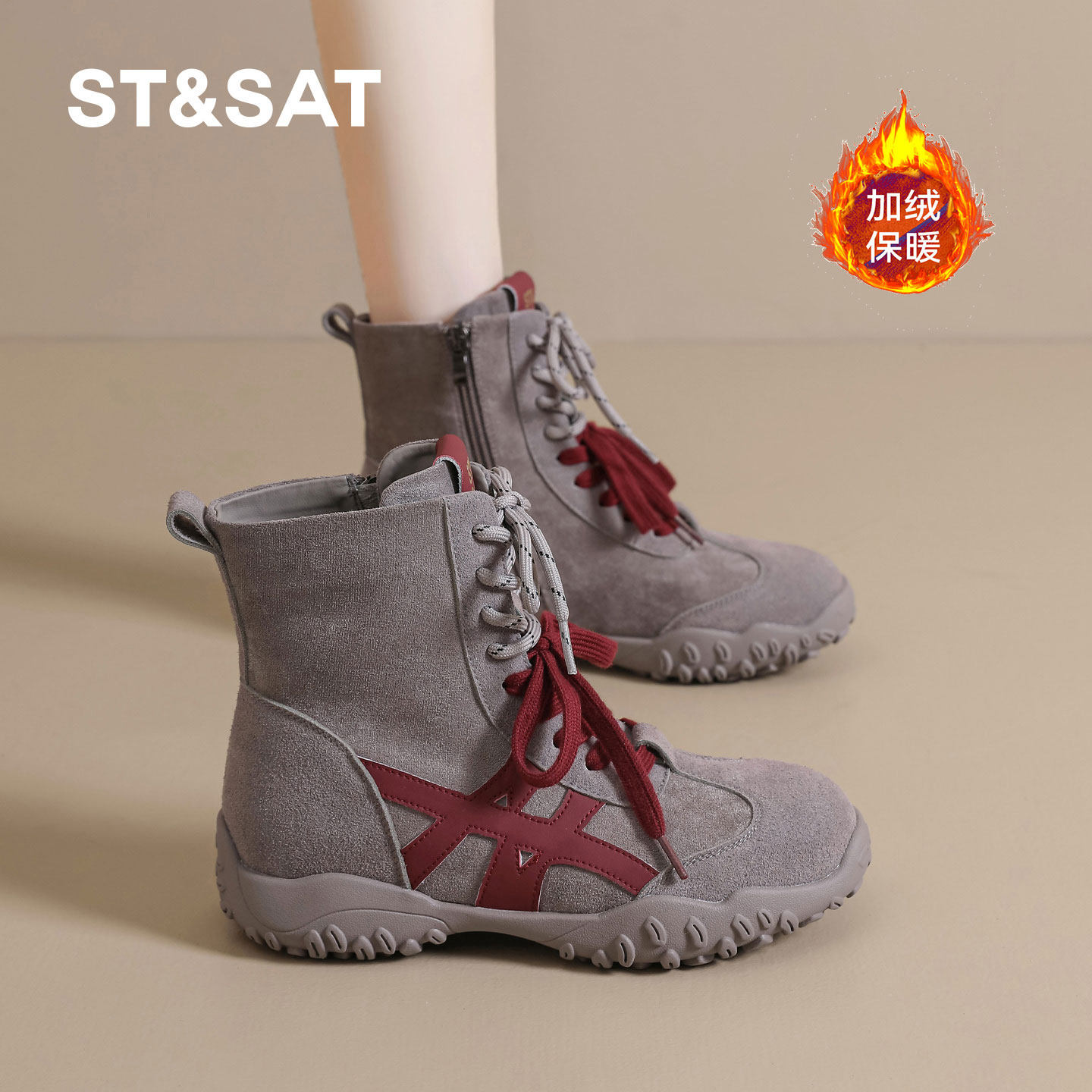 星期六马丁靴女2025冬季新款加绒加厚高帮鞋网红双鞋带运动短靴子