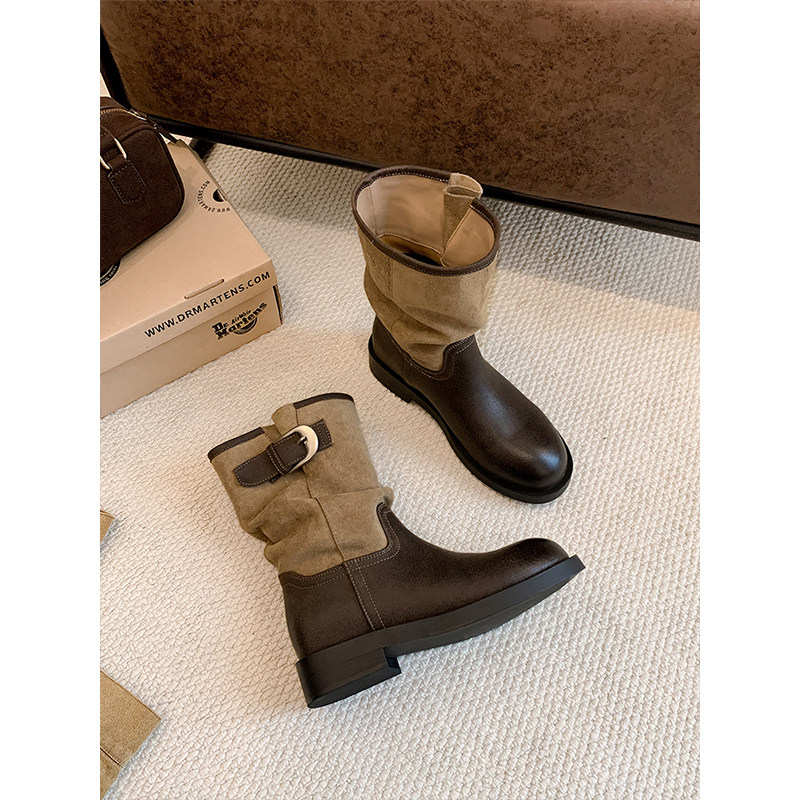 靴子短靴女2025新款棕色骑士靴堆堆靴内增高黑色复古中跟圆头小腿