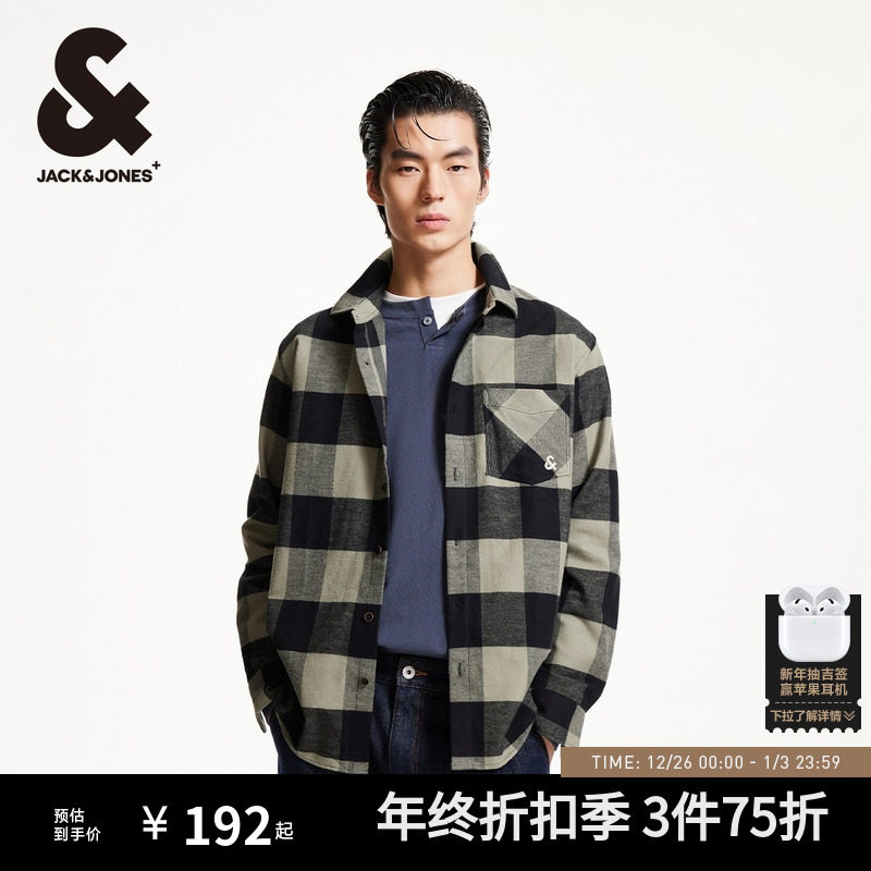 杰克琼斯男装潮流百搭时尚尖领刺绣贴袋口袋撞色格纹秋季磨毛衬衫