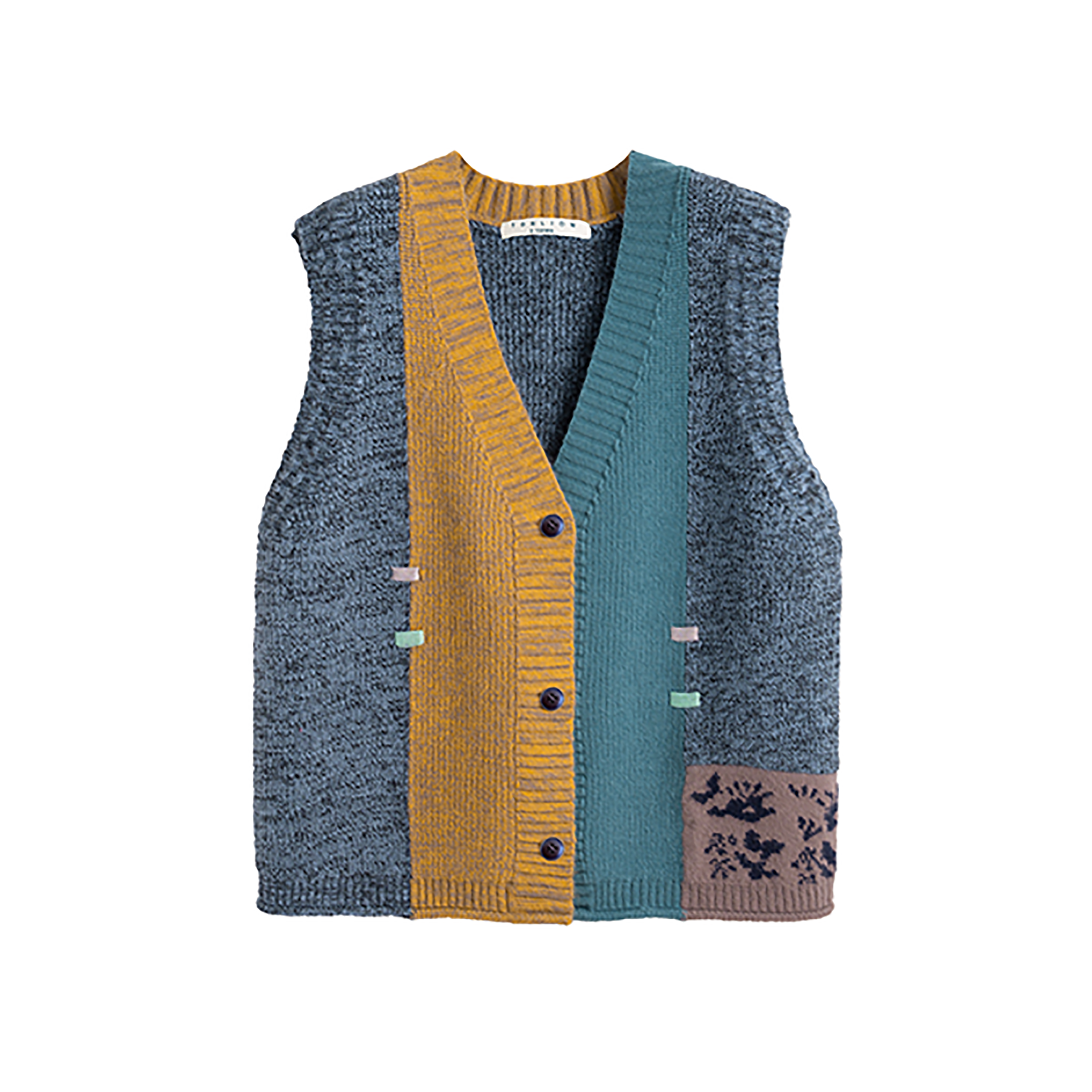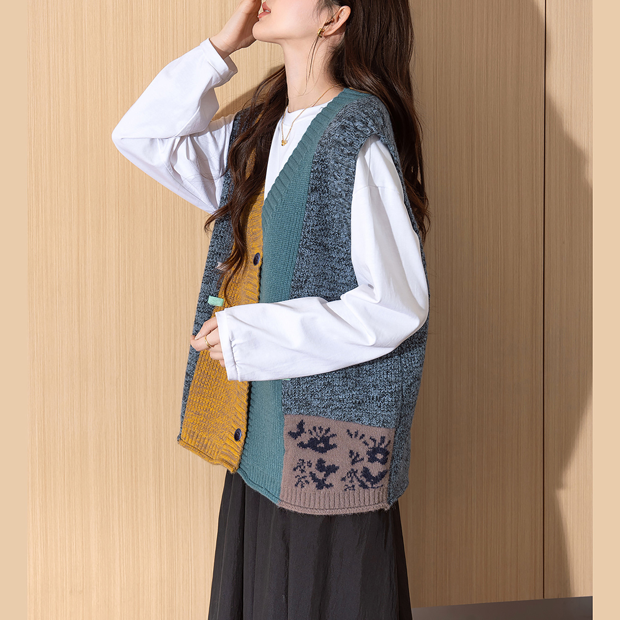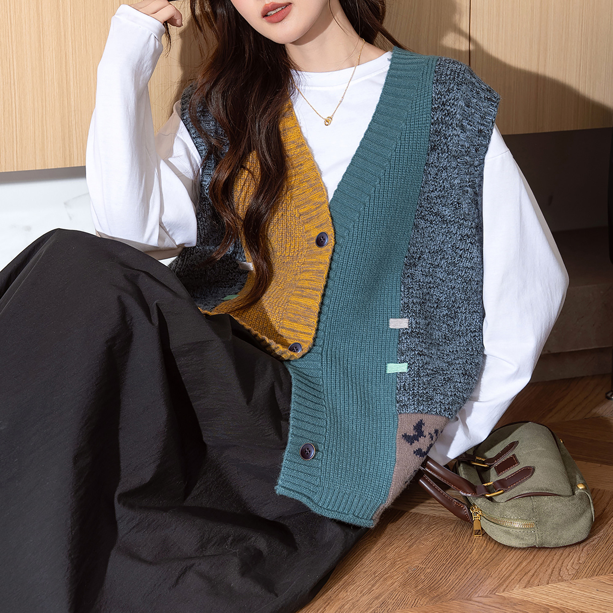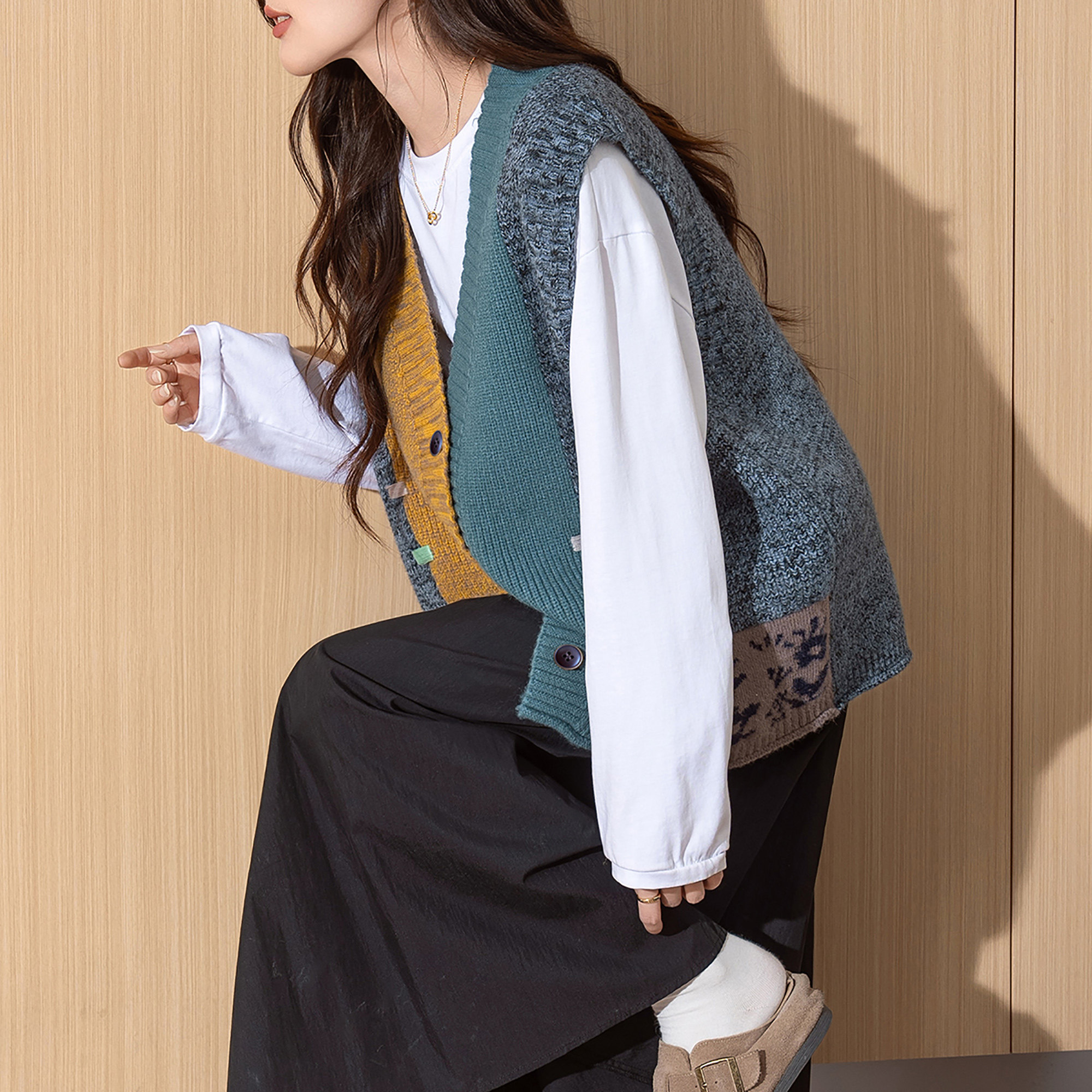 唐狮秋冬季女毛衣复古风拼色设计V领开衫马甲背心百搭流行tu