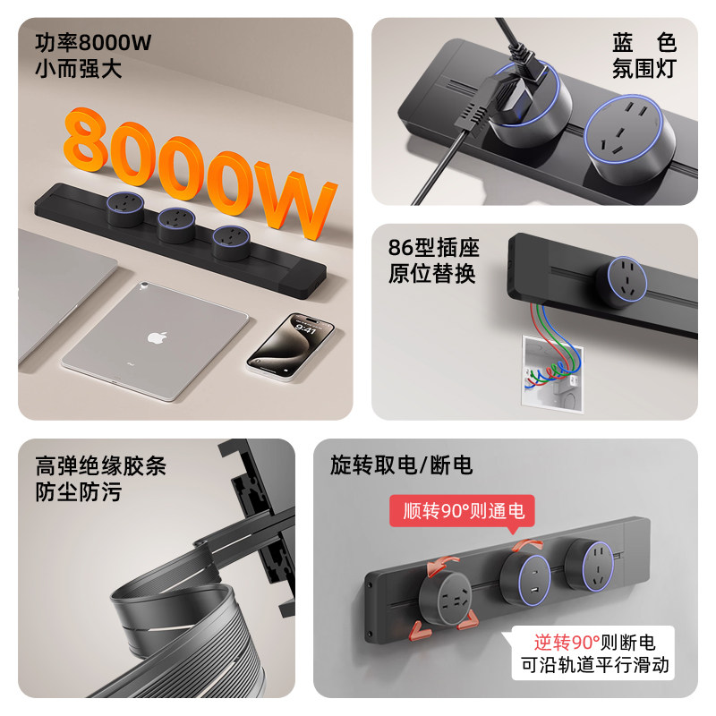 可移动轨道插座多功能家用电力滑动导轨电源客厅卧室电器厨房排插