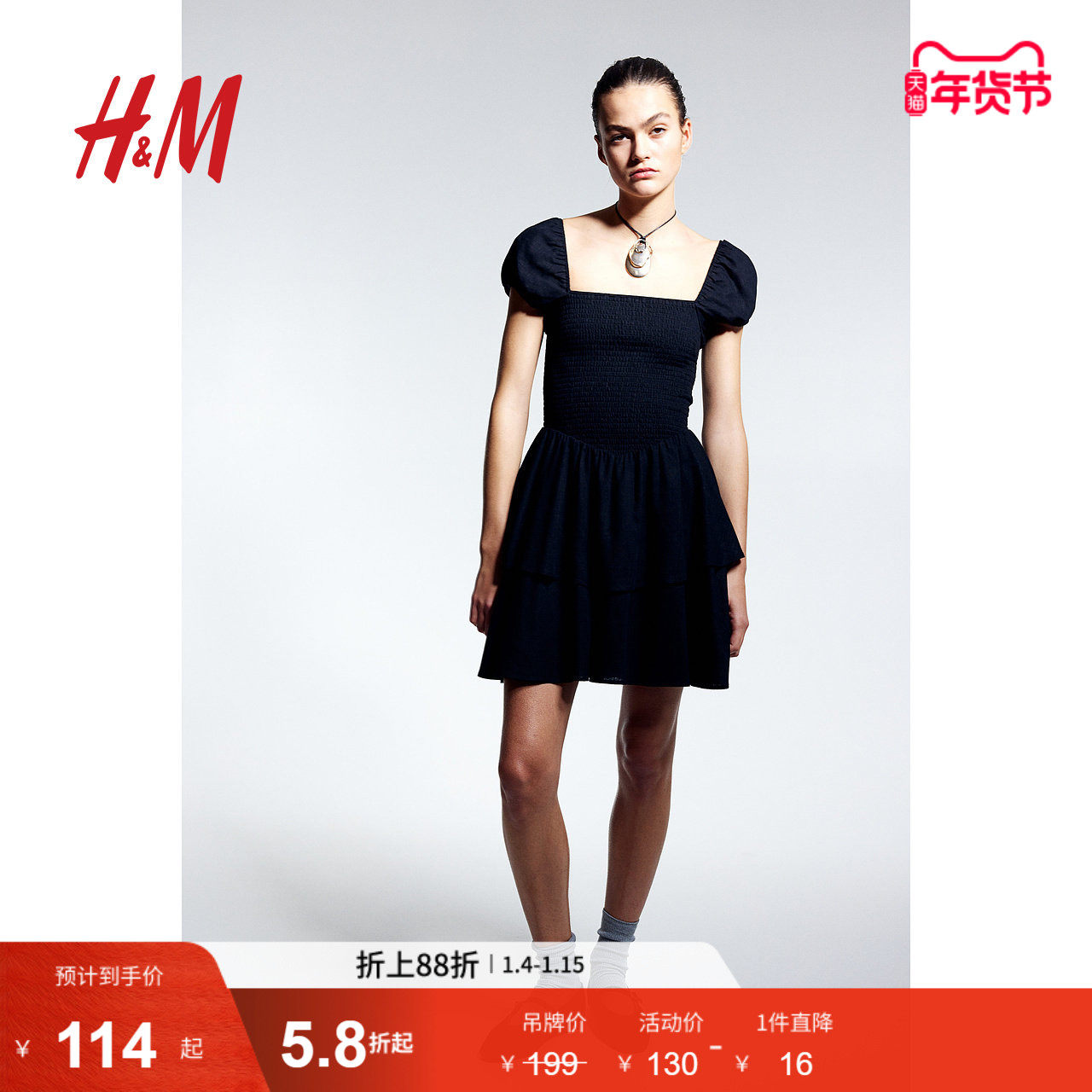 HM女装衣裙春季分层裙摆缩褶连方领泡泡袖蛋糕裙1219988