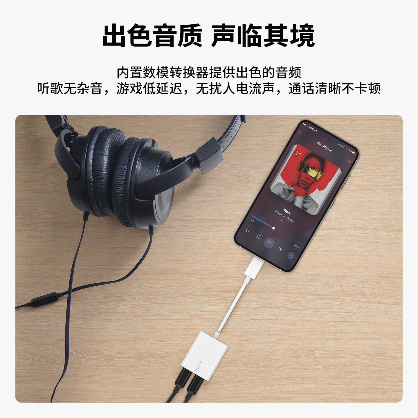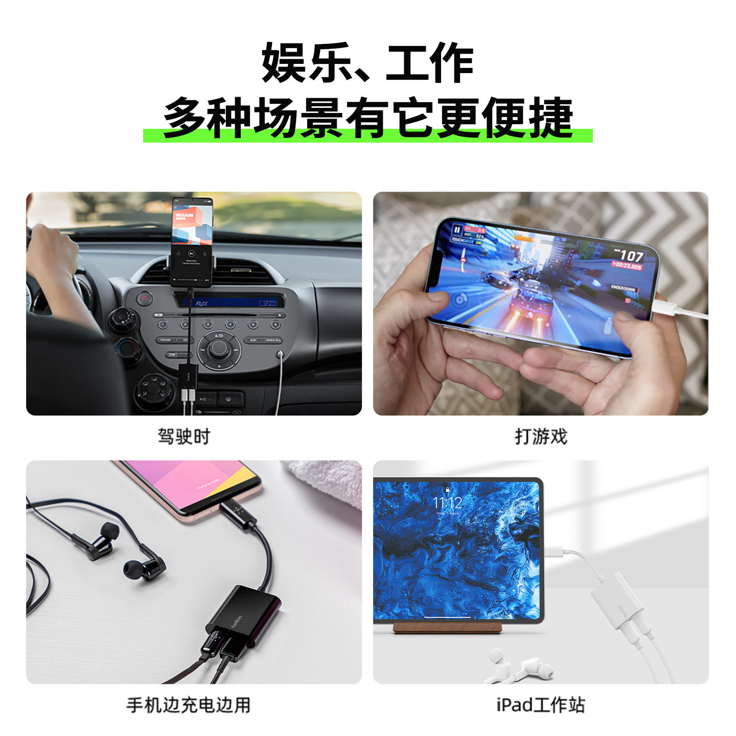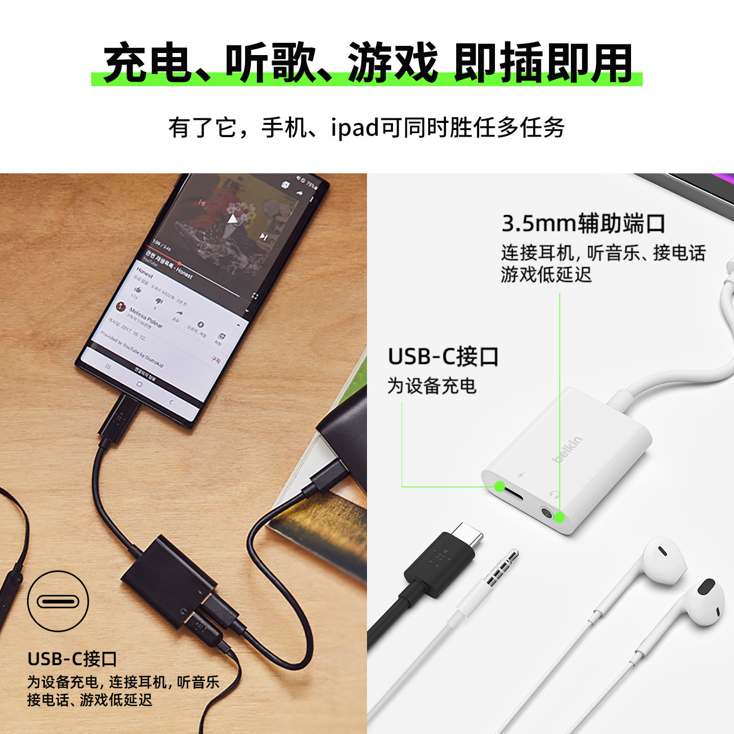 Belkin贝尔金一分二转换器USB-C转3.5mm手机Type-C耳机充电音频分线器适用iPhone苹果ipad转接头游戏