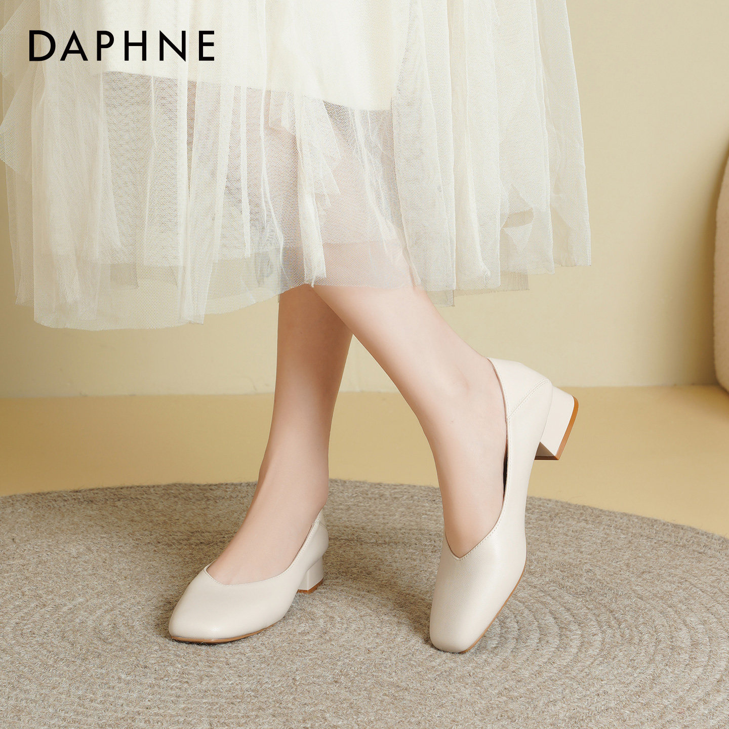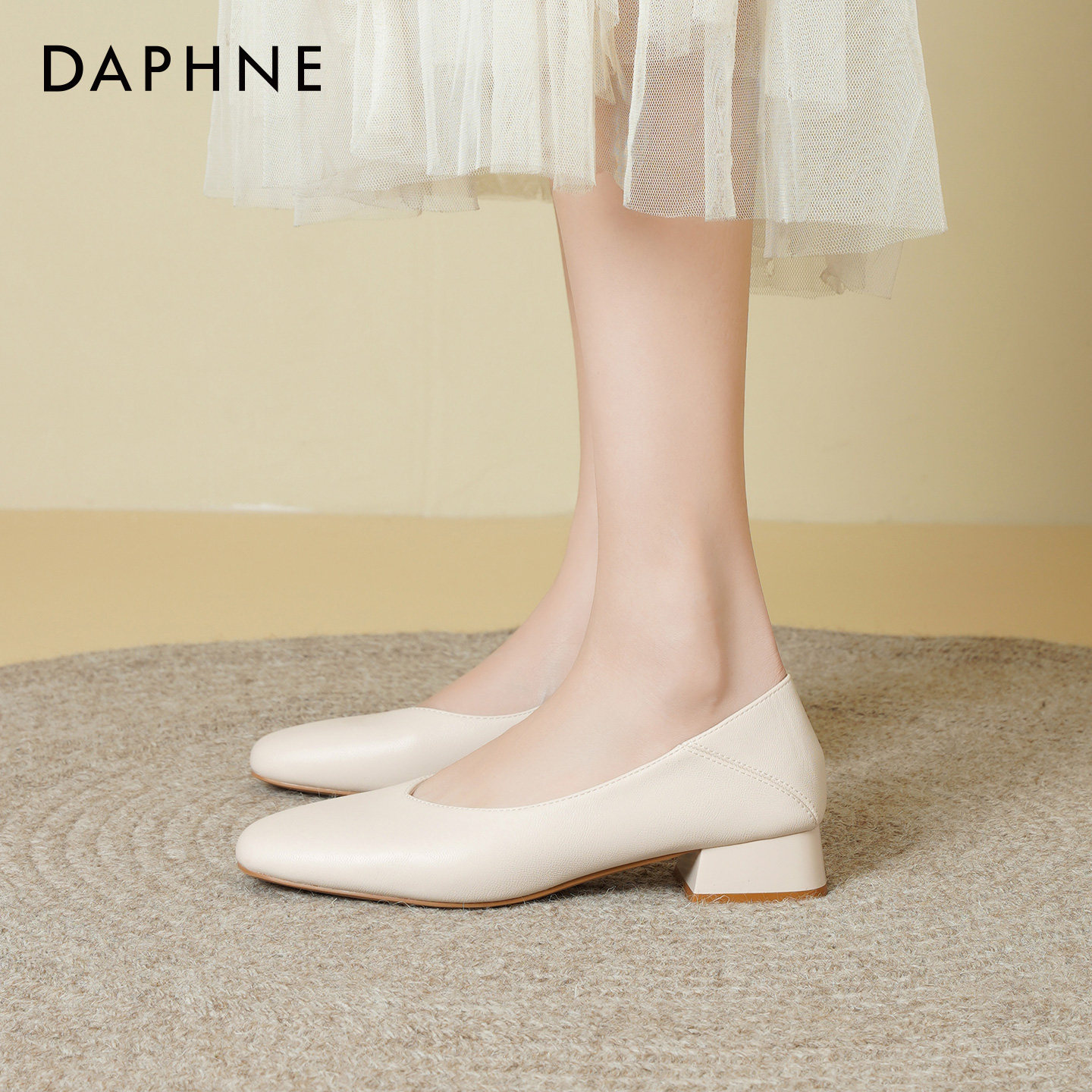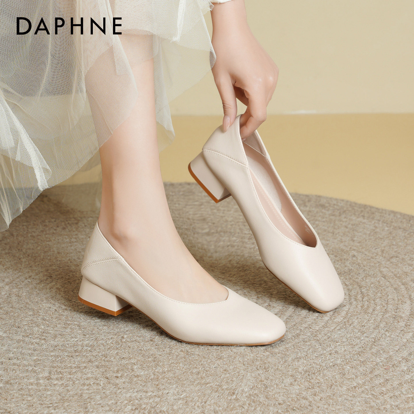 达芙妮方头粗跟单鞋女2026新款春季软皮浅口高跟鞋工作通勤皮鞋女