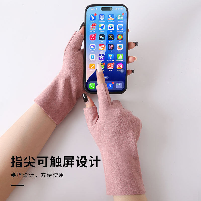 德绒手套男女秋冬保暖自发热双面加绒加厚露指学生写字触屏护手套