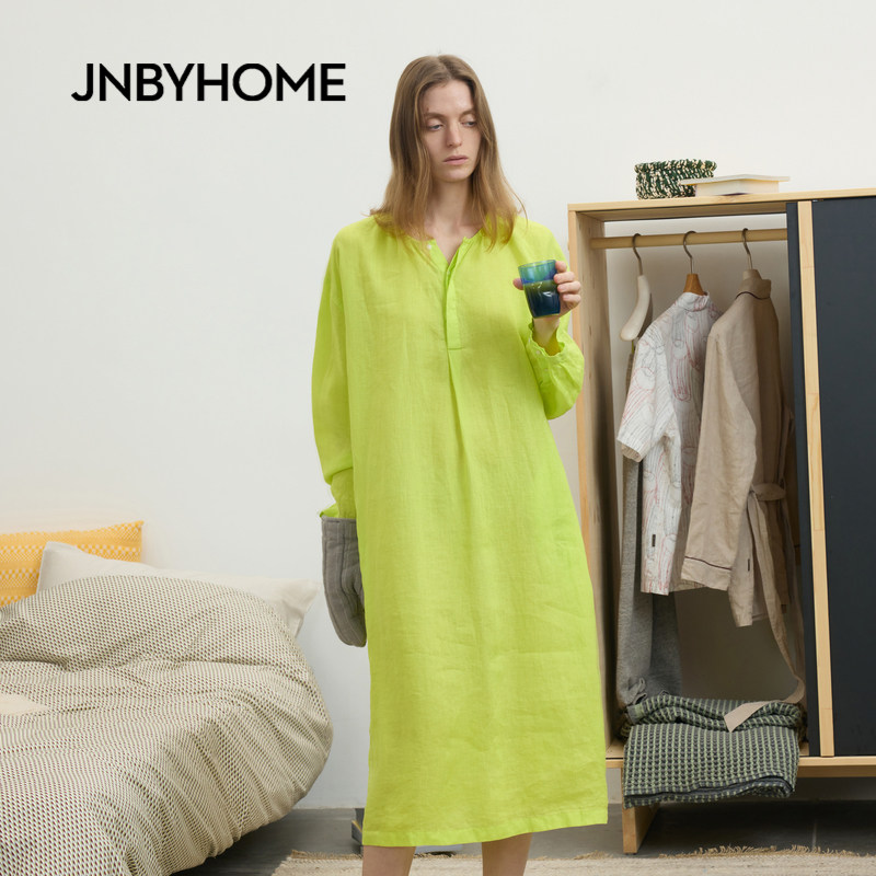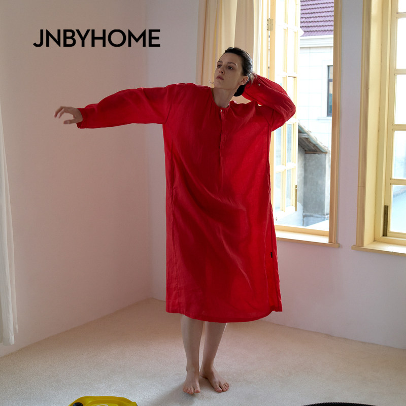 JNBYHOME江南布衣26新品春夏长袖长裙家居睡裙宽松亚麻干爽中长款