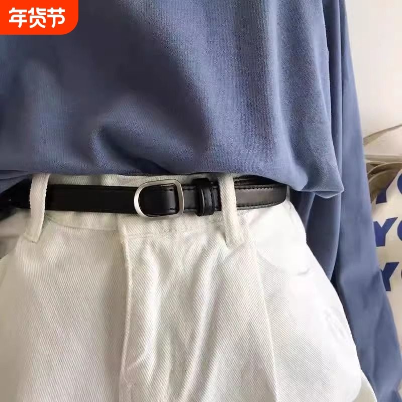 韩国东大门2024新款韩版黑色小腰带无孔扣皮带软免打孔裤带银扣
