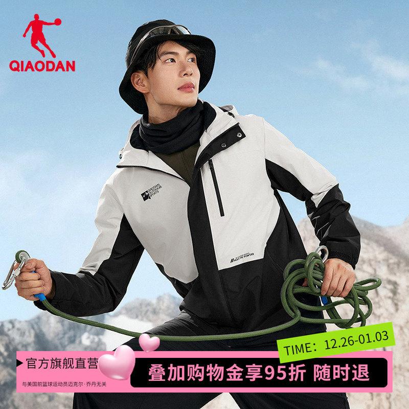 乔丹户外三合一风衣男2025冬季新款保暖防风冲锋黑色外套防水登山