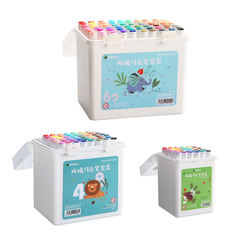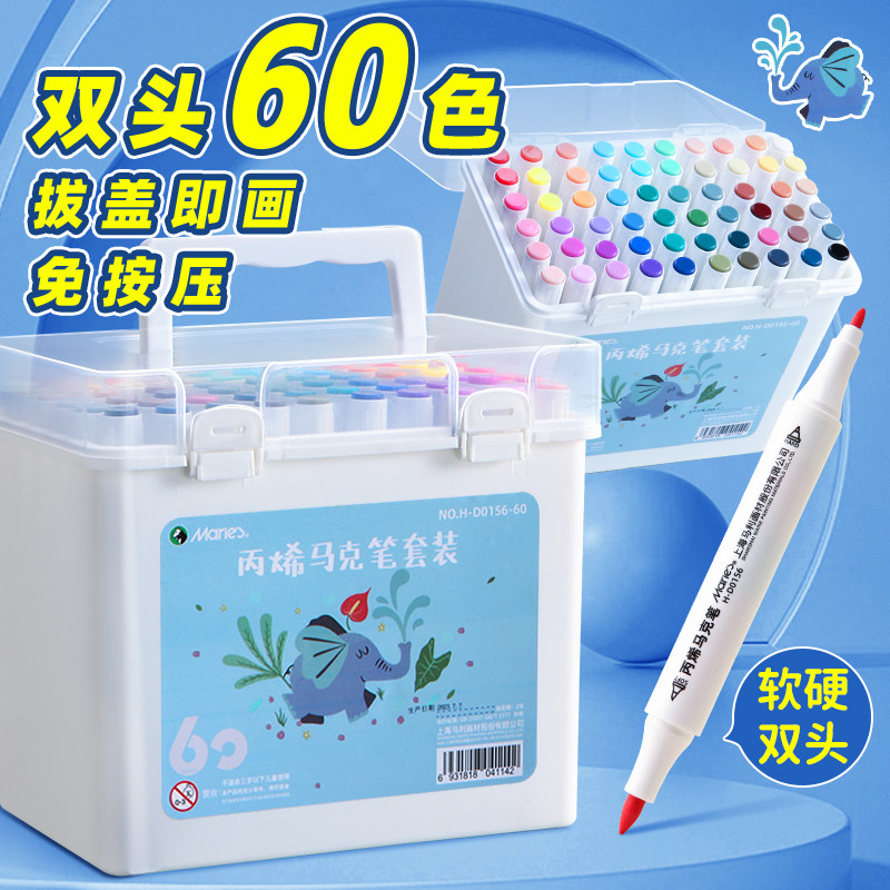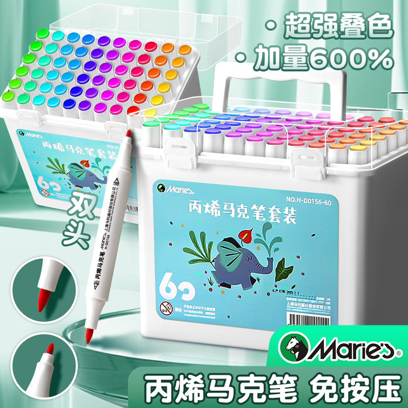 马利丙烯马克笔双头36色48儿童学生美术专用防水不透色可叠色比西笔芯画画笔无毒水洗比心碧玺炳漆炳稀软绘烯