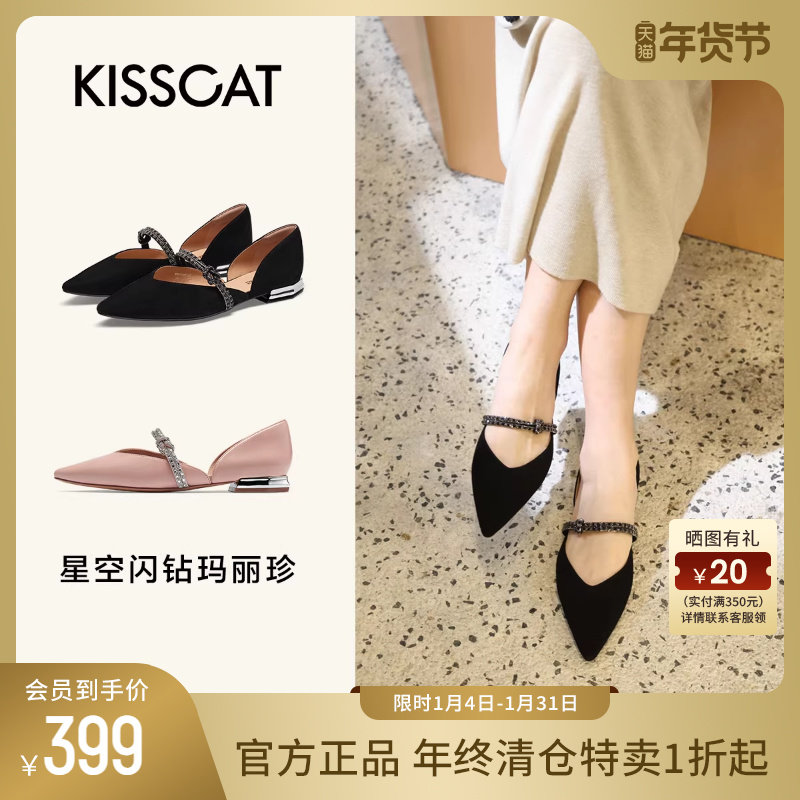 KISSCAT接吻猫秋季新款通勤法式平底空鞋气质钻条尖头单鞋女