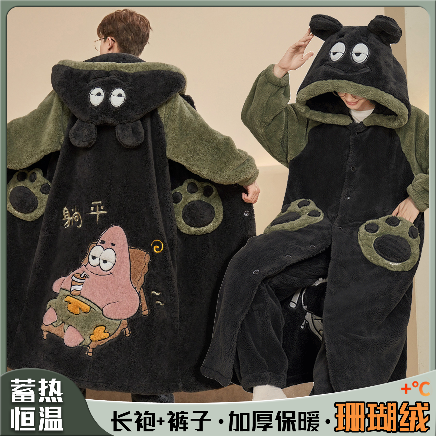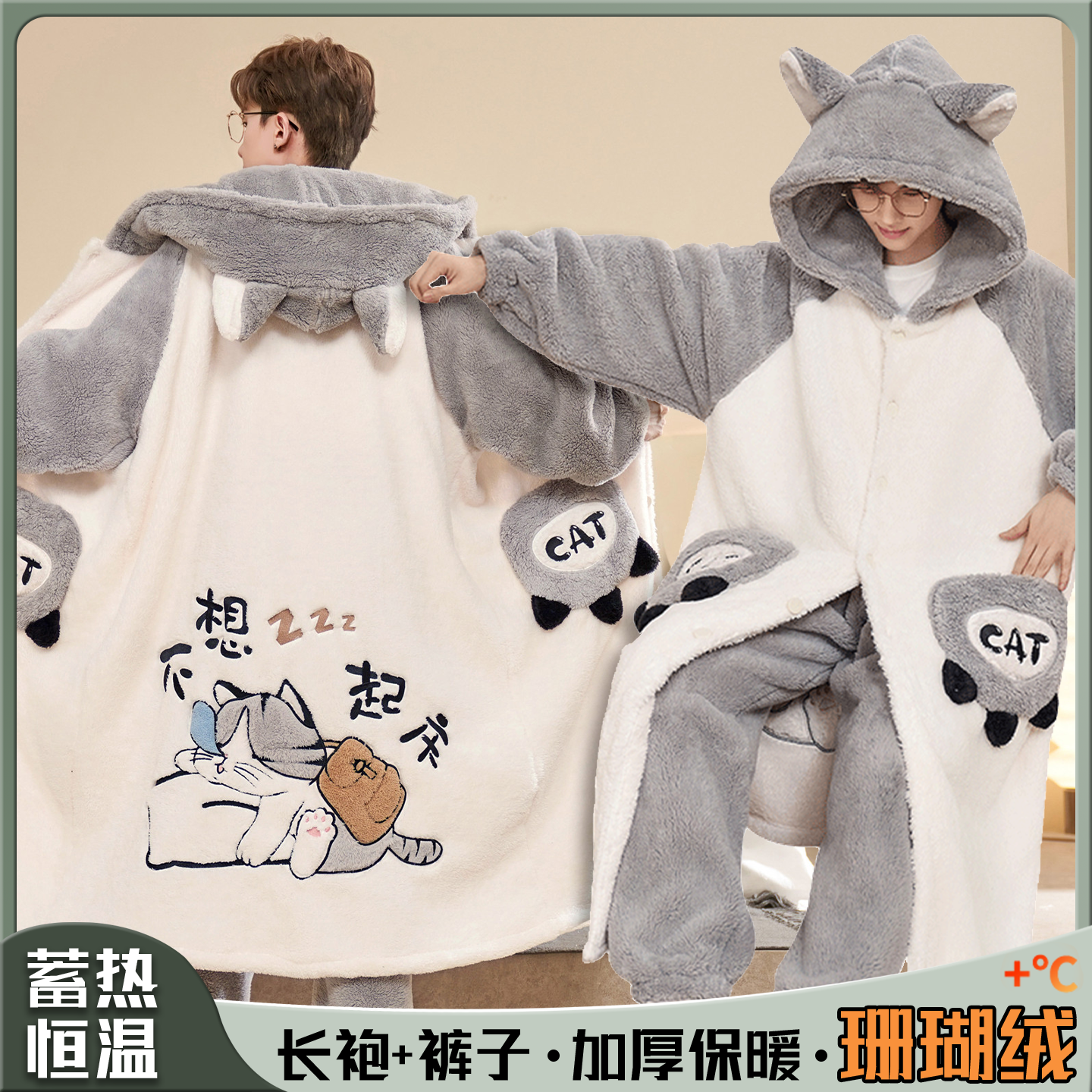 秋冬季男款睡衣珊瑚绒加绒加厚可外穿2026新款中长款保暖睡袍套装