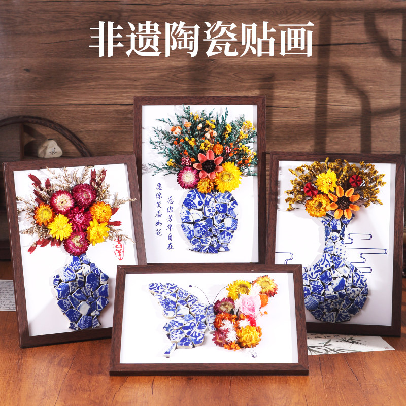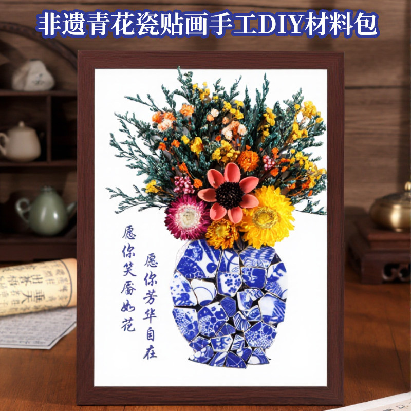 非遗手工青花瓷陶瓷画diy材料包永生干花相框女神节暖场沙龙活动