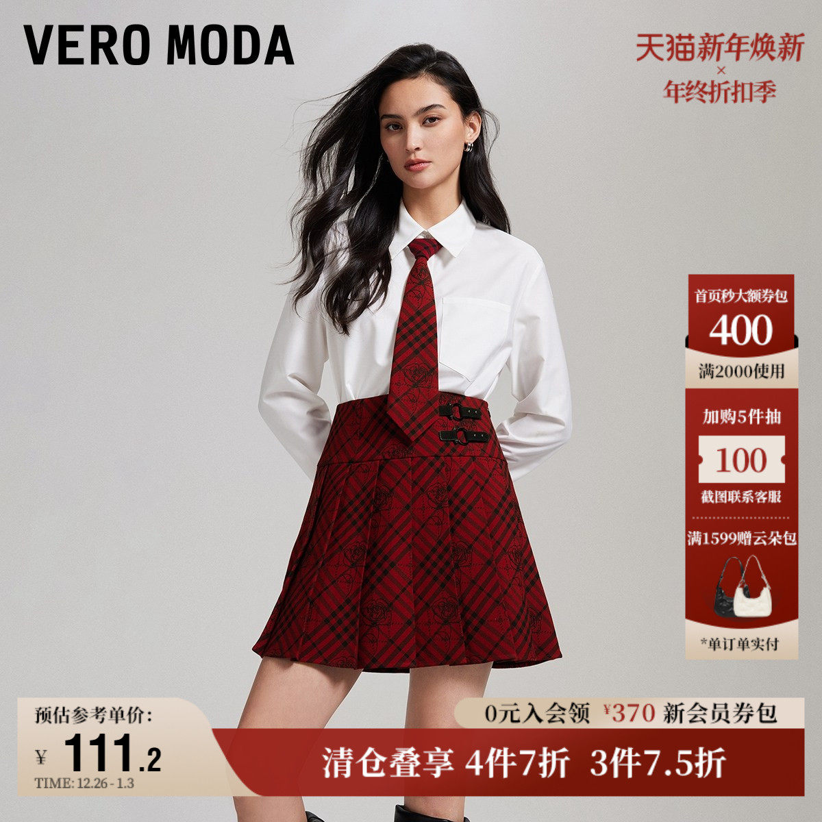 Vero Moda奥莱半身裙秋季新款高腰百褶字母玫瑰图案格纹裙流行
