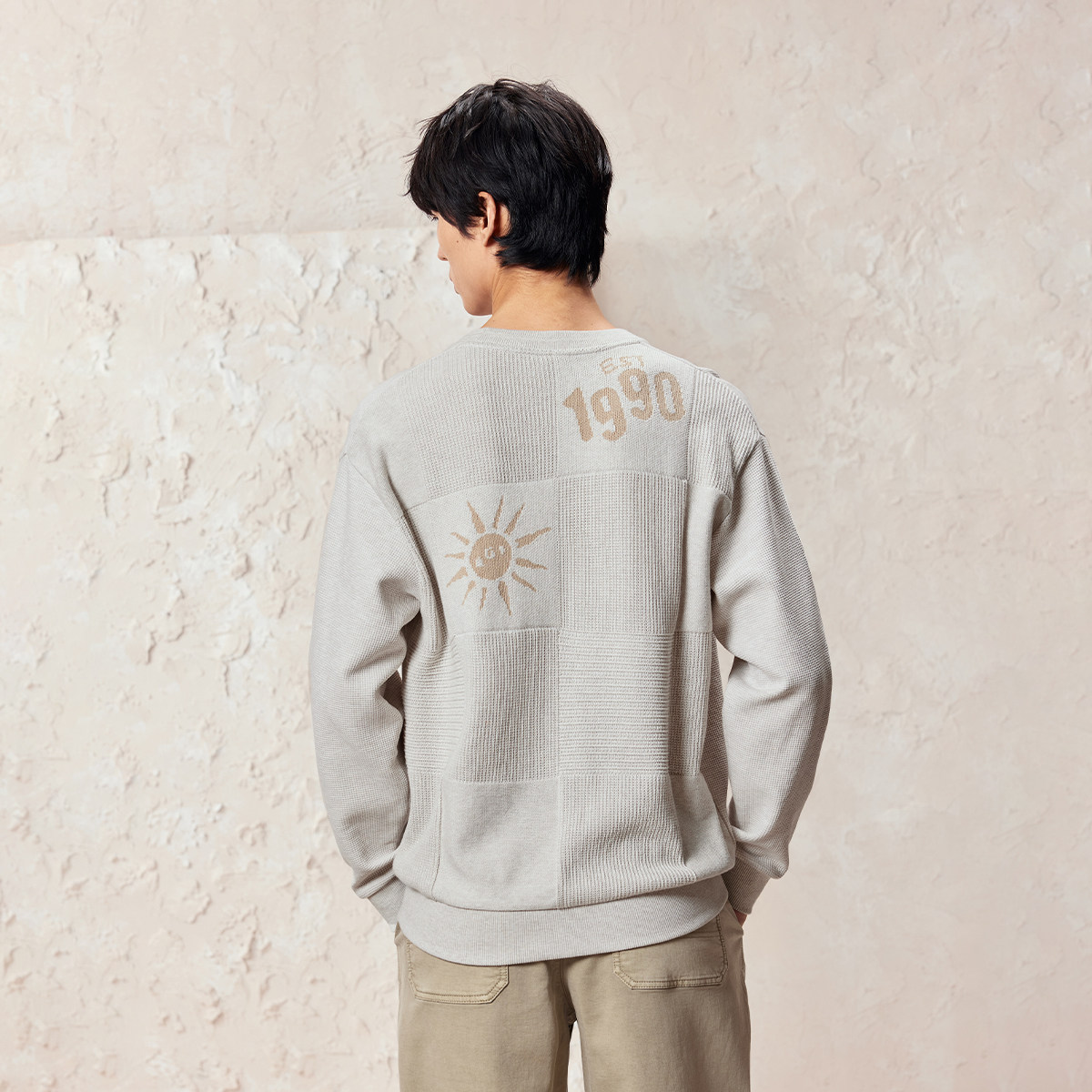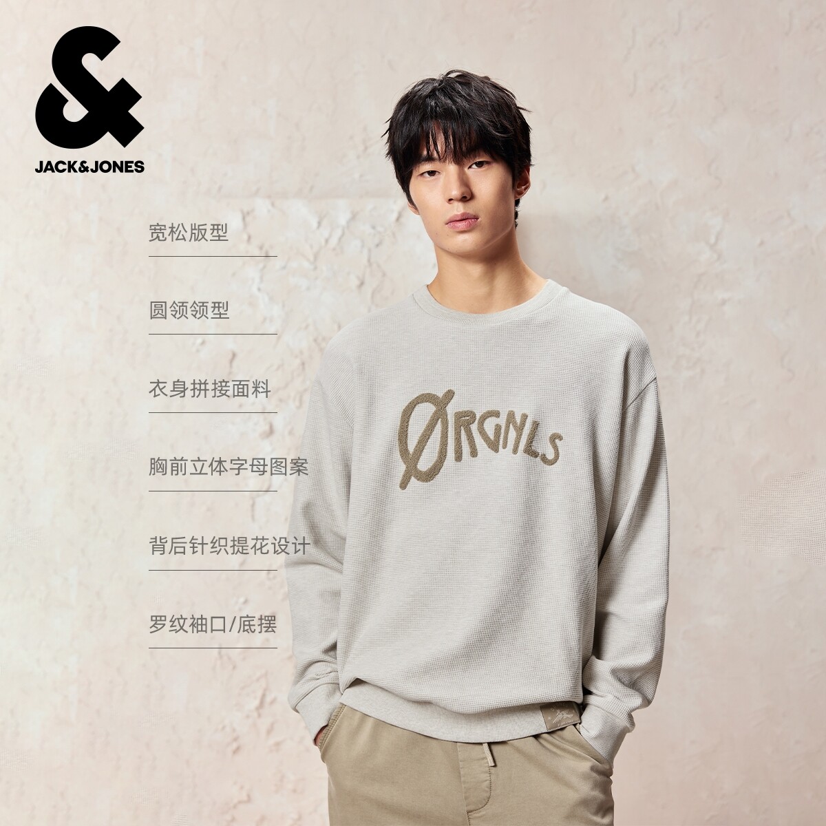 杰克琼斯男装春季毛衣罗纹针织衫宽松圆领字母针织提花款长袖上衣