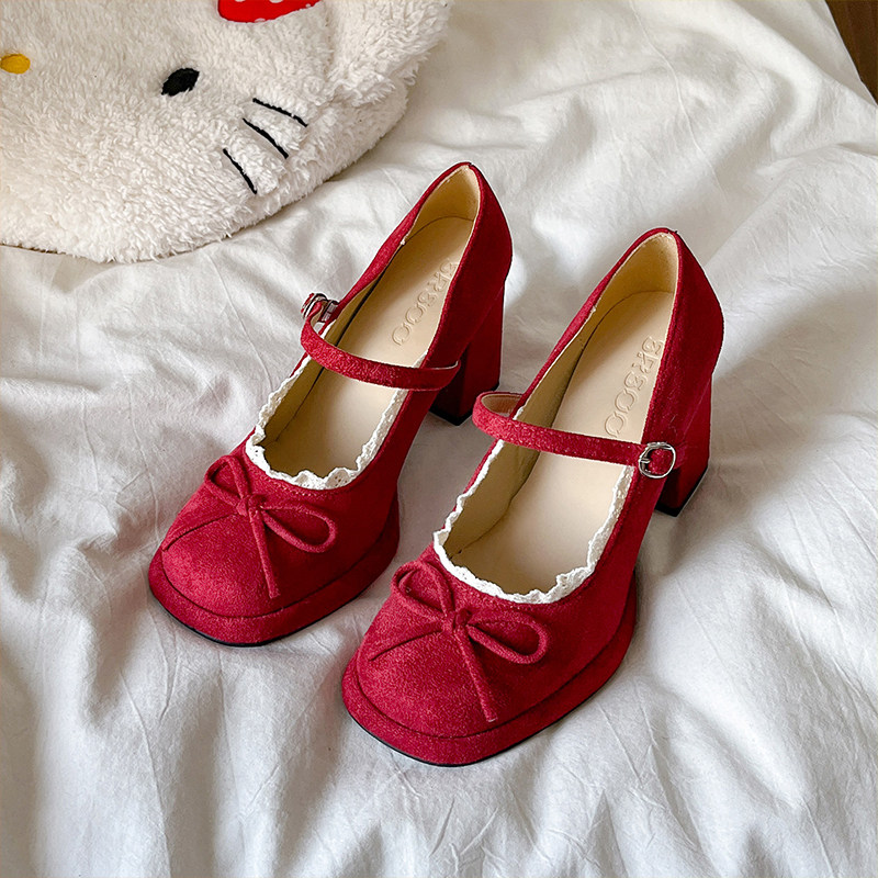 真皮~骄屿法式仙女风高跟鞋女婚鞋玛丽珍鞋珍珠系蝴蝶结粗跟单鞋