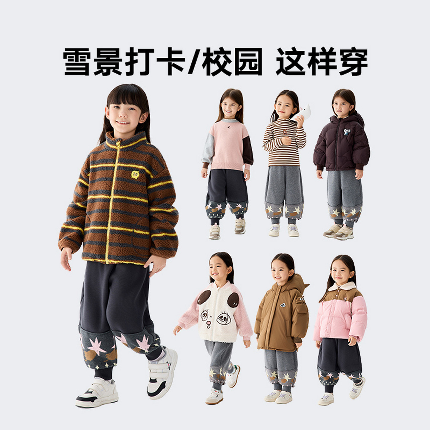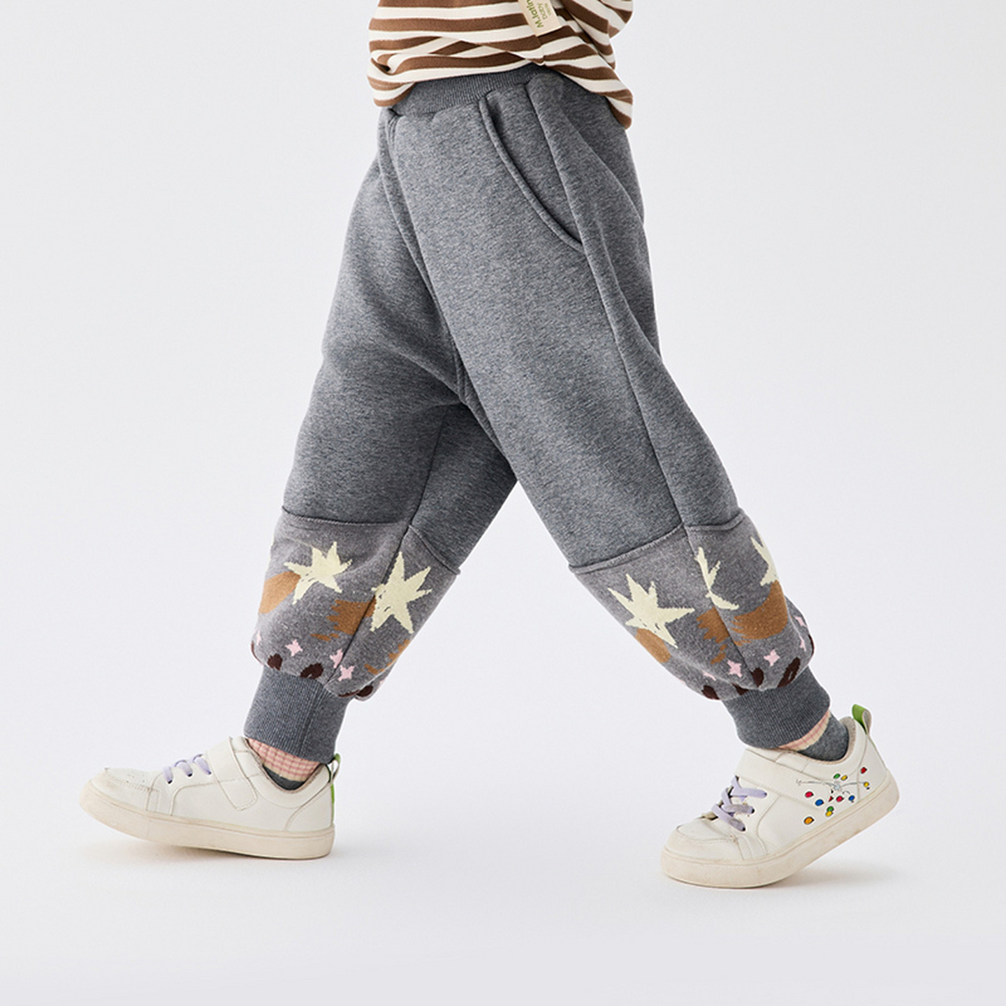 主题图案毛织片提花拼接,女童廓形针织裤