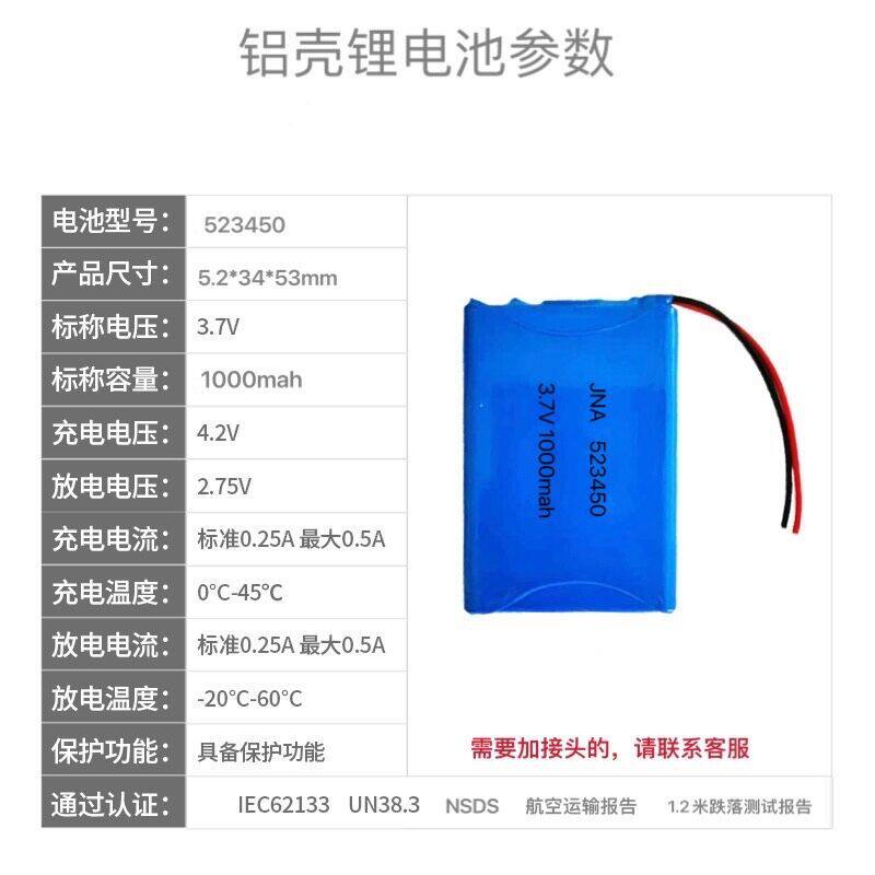 523450铝壳锂电池3.7V台灯蓝牙音箱玩具美容仪风扇锂电池