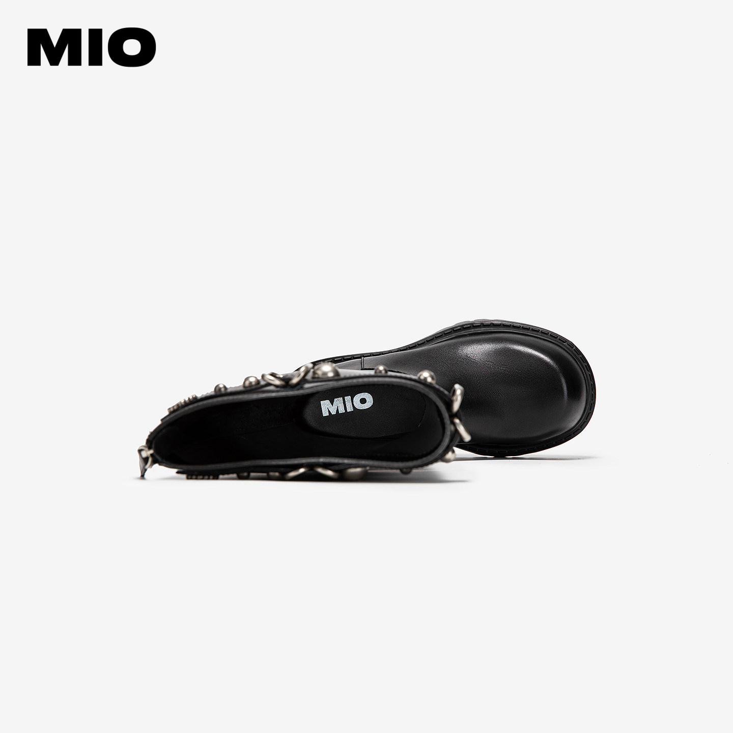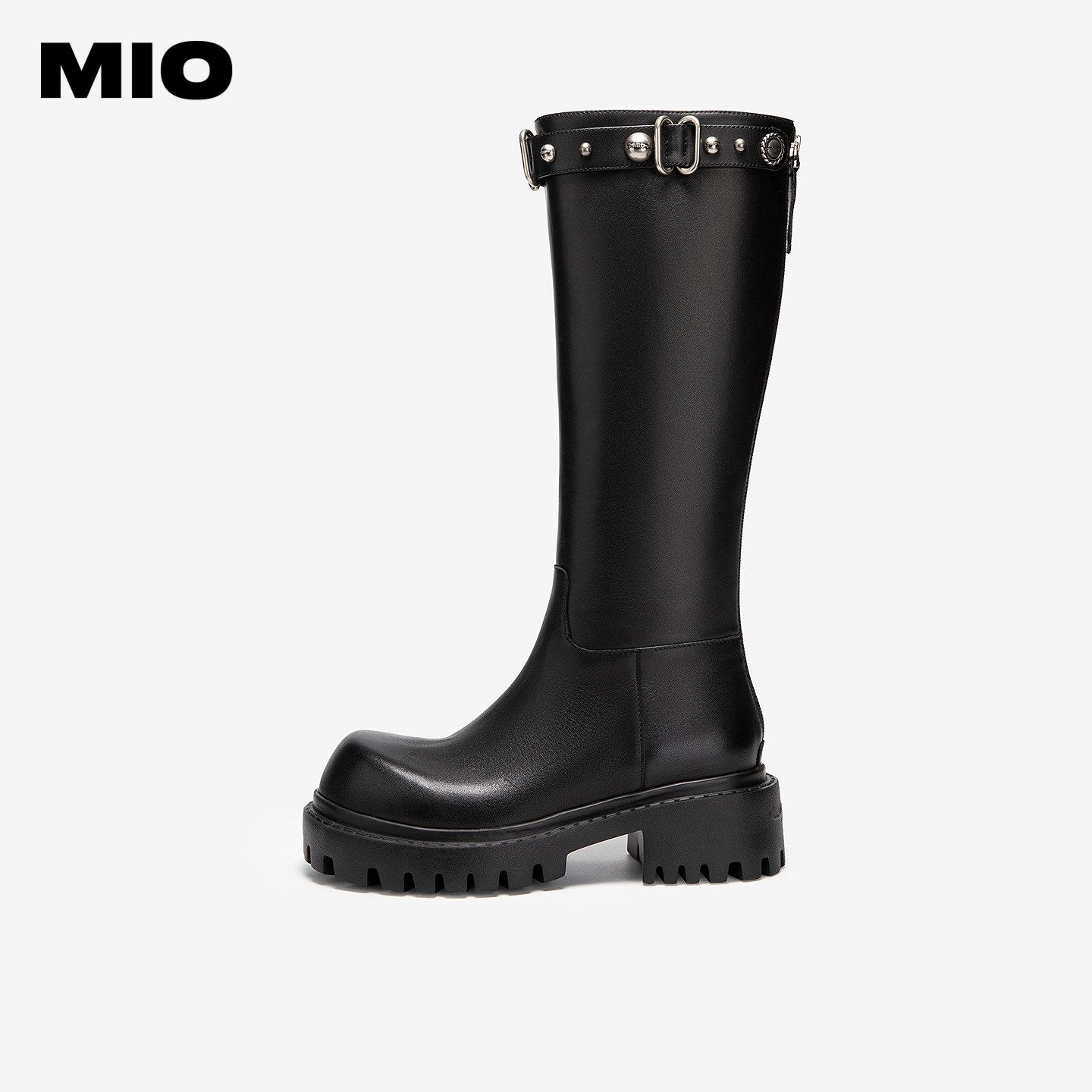 MIO米奥机车骑士靴厚底5cm女鞋冬季新款韩系铆钉黑色牛皮革长靴
