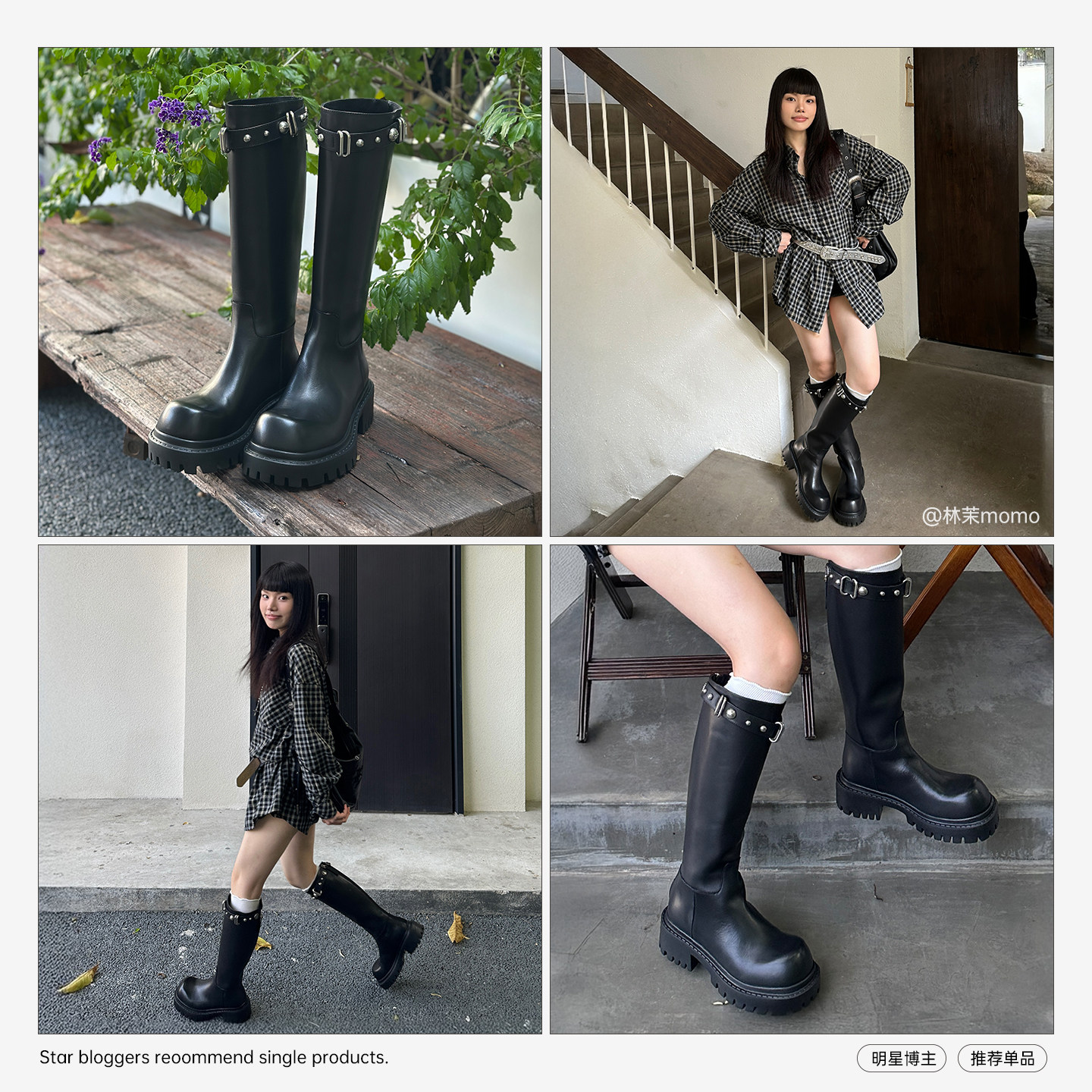 潼潼TONG毒液靴皮带扣高筒骑士靴2025新款真皮复古粗跟厚底机车靴