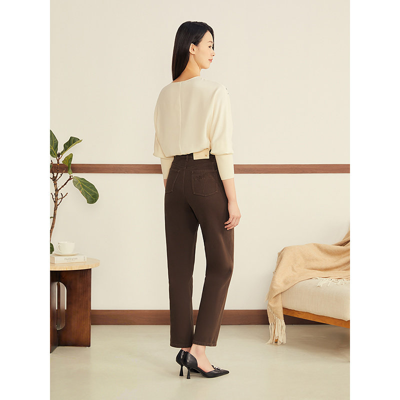 YINER音儿2025冬季新款法式舒柔种子绣花高腰小脚棉弹牛仔休闲裤