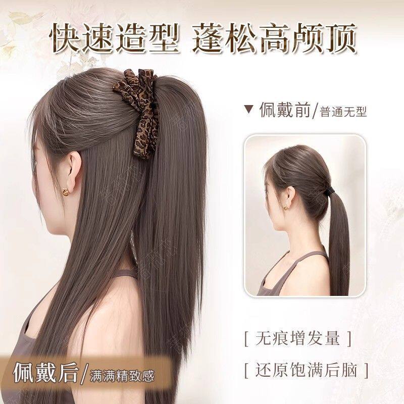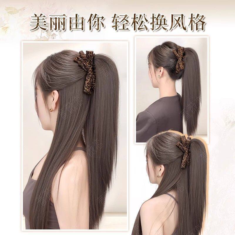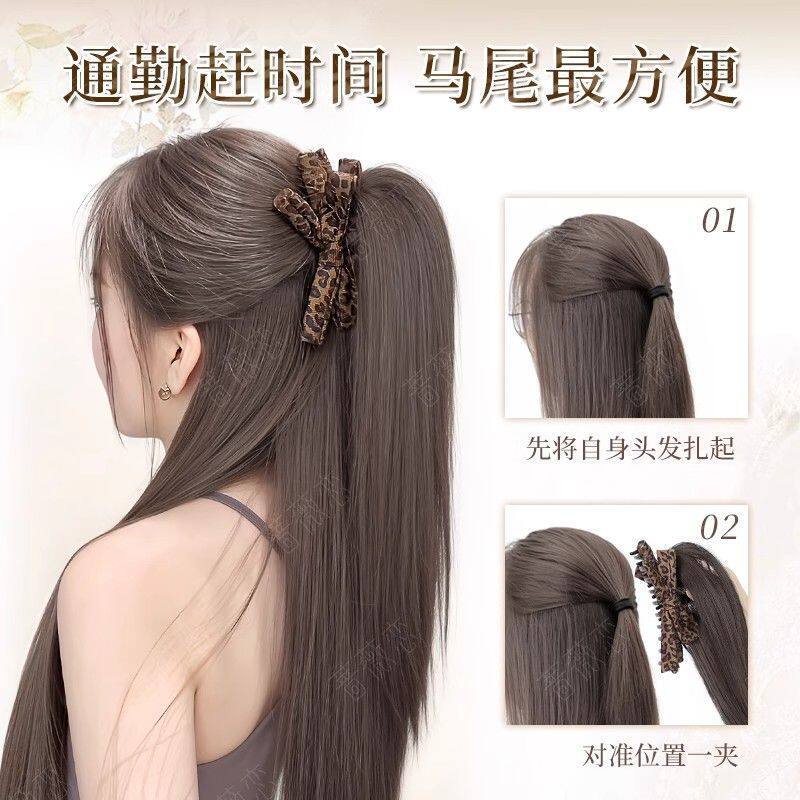 马尾假发女仿真自然抓夹瀑布半扎高豹纹蝴蝶结发饰假发辫蓬松长发