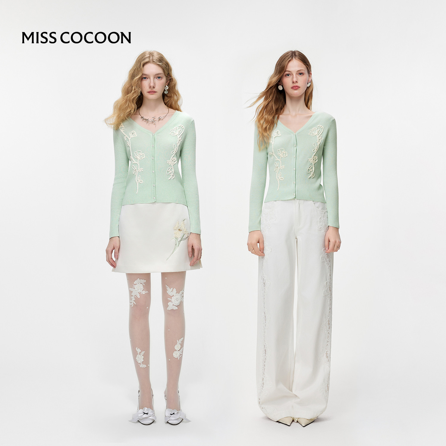 MISSCOCOON可可尼V领毛衣开衫外套女2026春季新款短款绿色针织衫