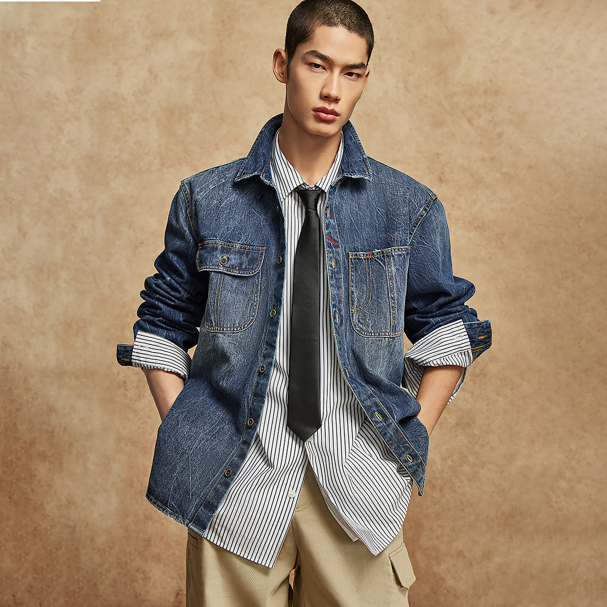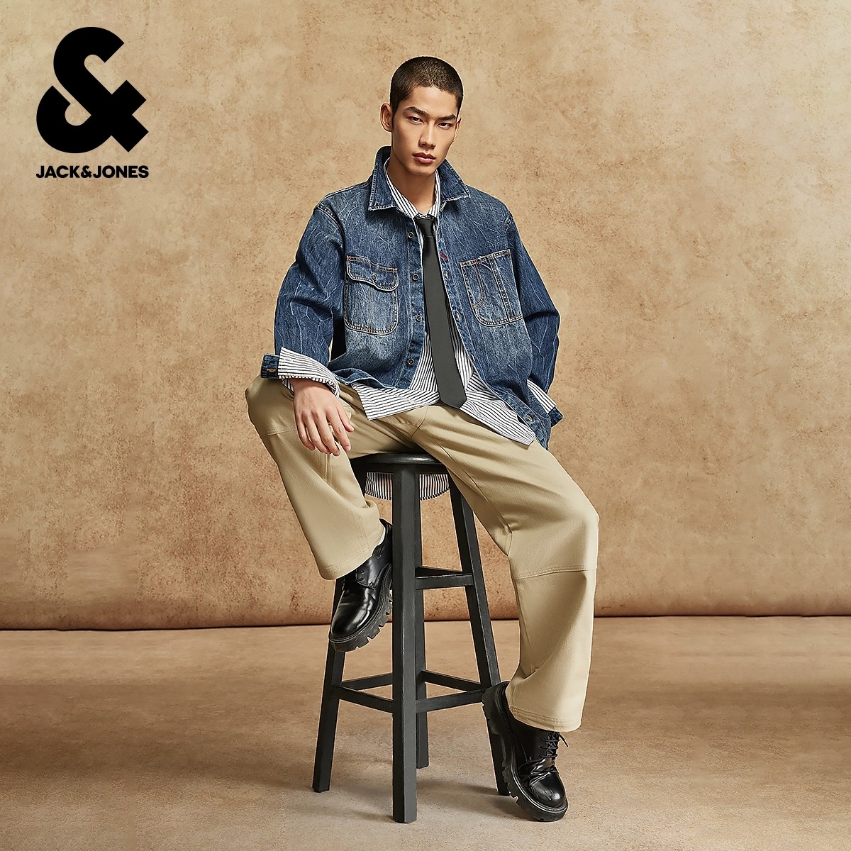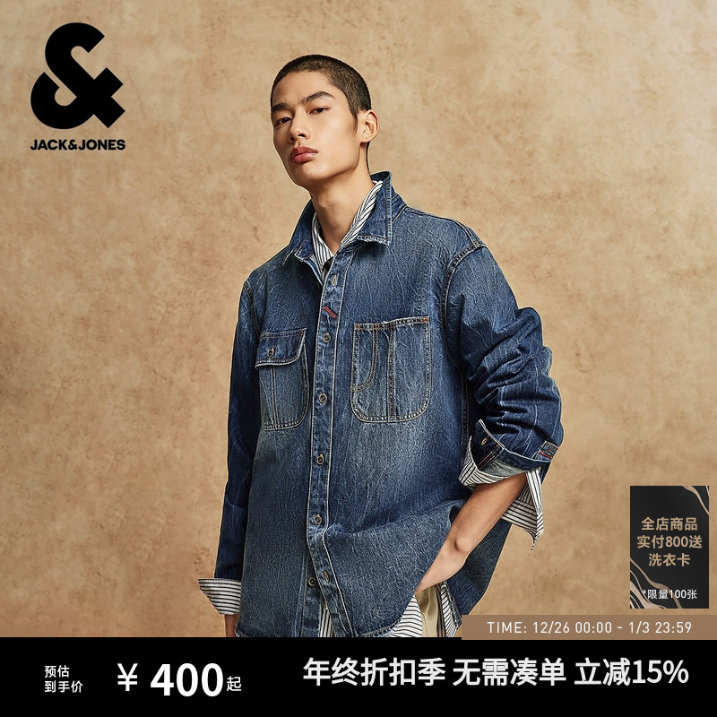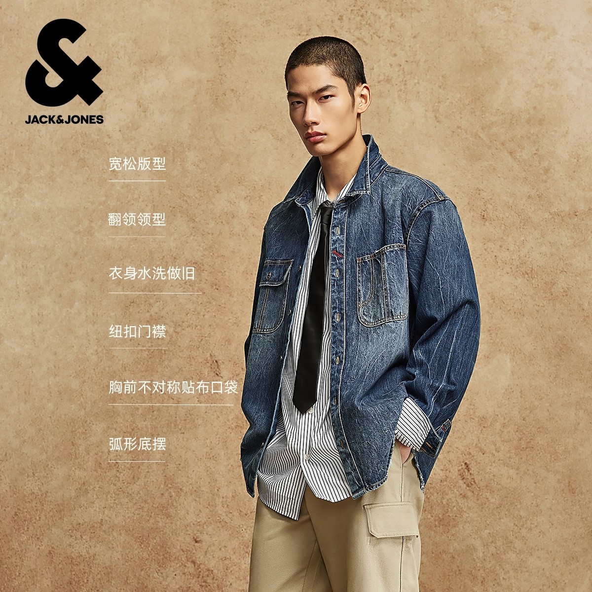 杰克琼斯男装秋季衬衫牛仔宽松翻领纯色磨毛做旧水洗纯棉百搭外套