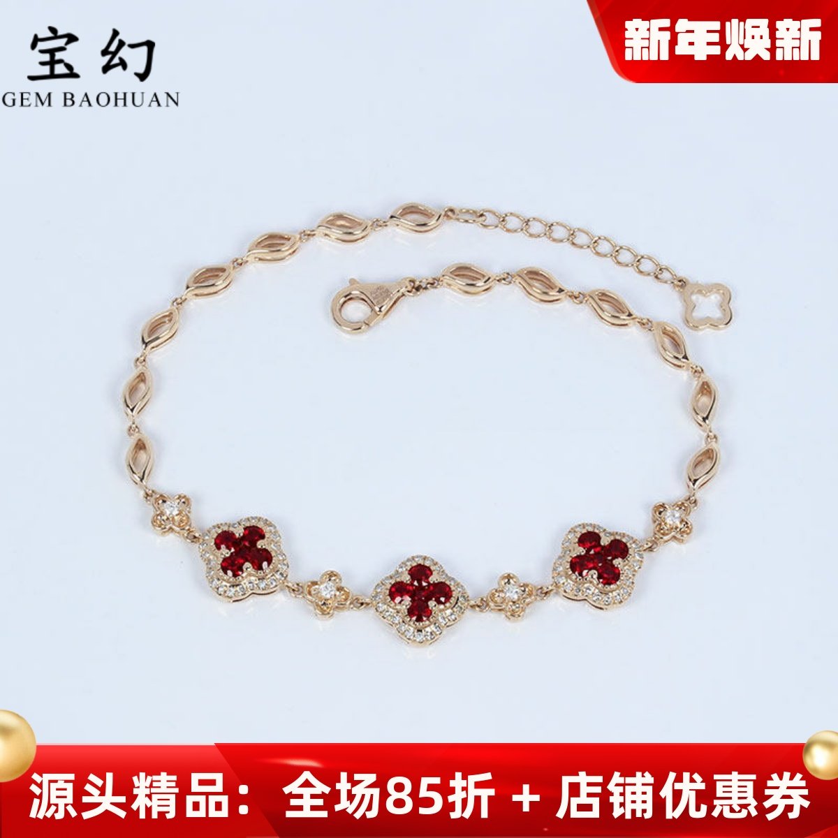 鸿运18K玫瑰金天然鸽血红宝石幸运四叶草手链 正红钻石可调节女款