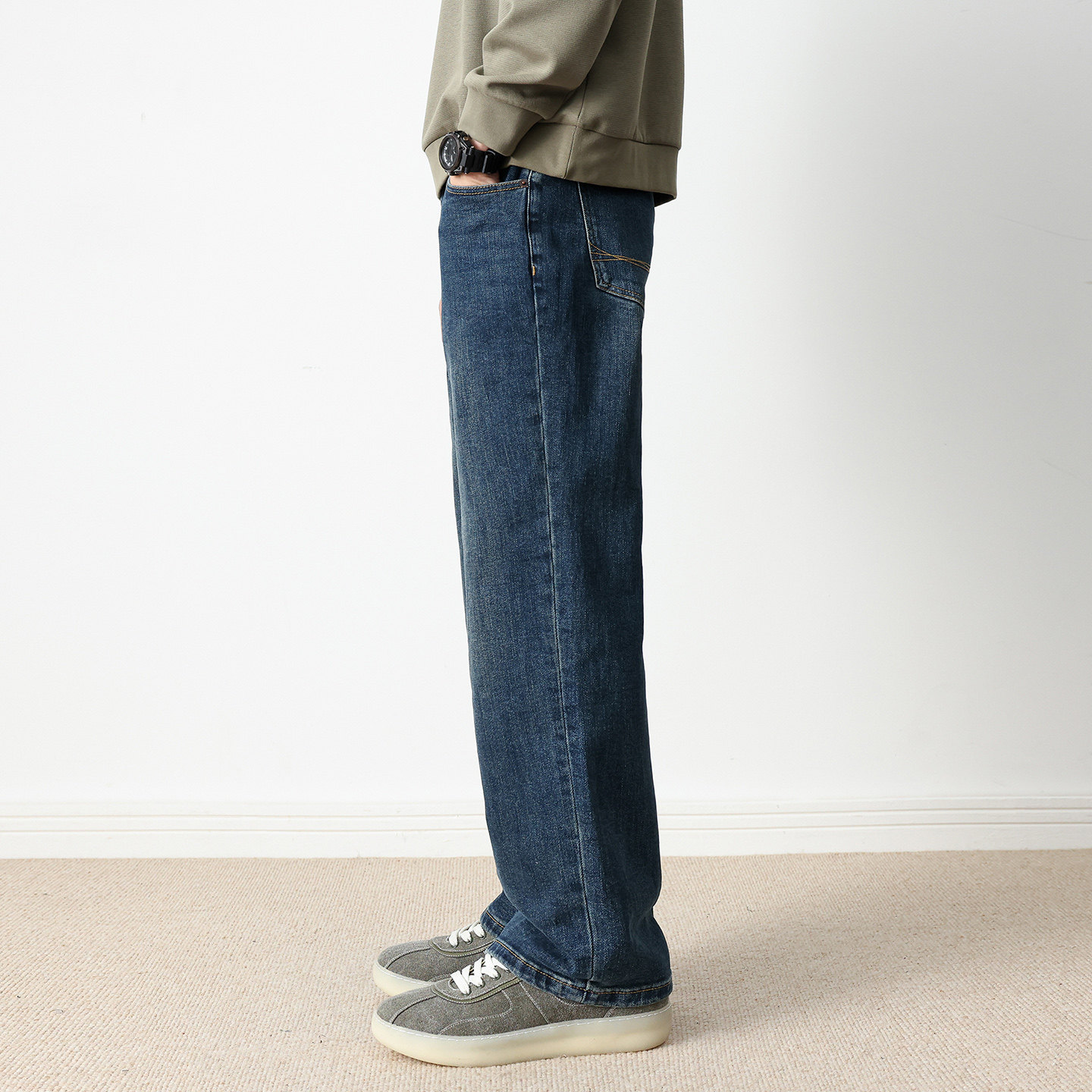 NEVERNEED原色加绒直筒牛仔裤男女冬季美式潮牌cleanfit宽松A字裤