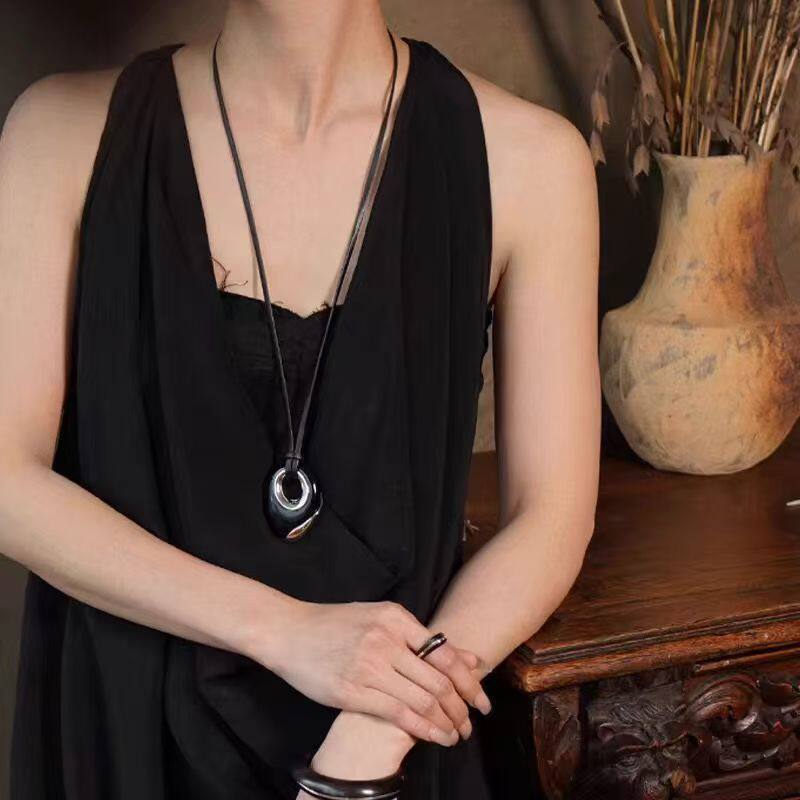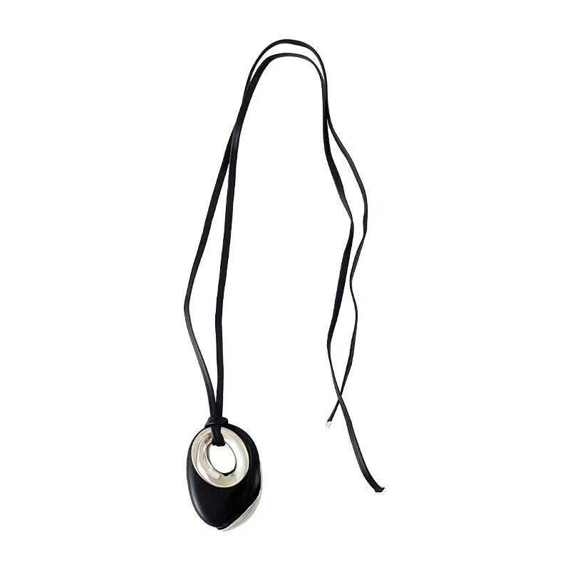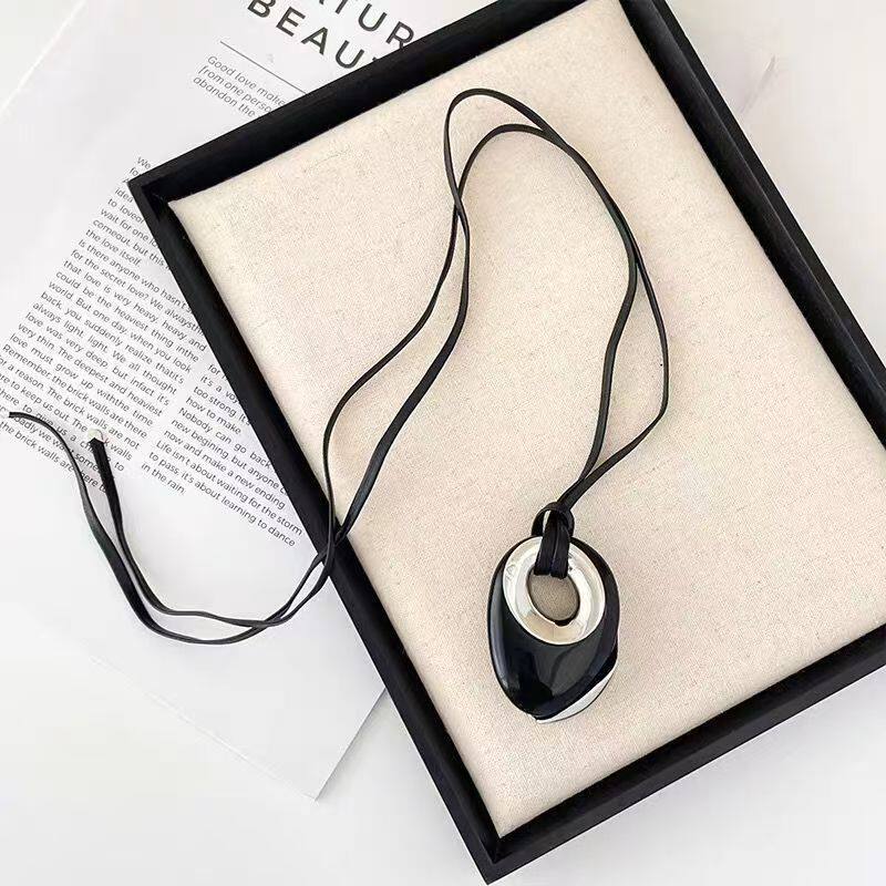 轻奢黑色圆形吊坠皮绳长款项链女小众设计高级感2025年新款毛衣链