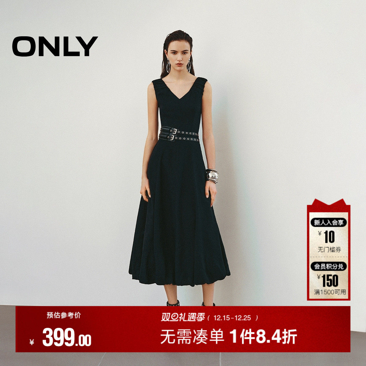 ONLY2025夏季新款简约纯色小黑裙显瘦V领无袖长裙花苞裙连衣裙女