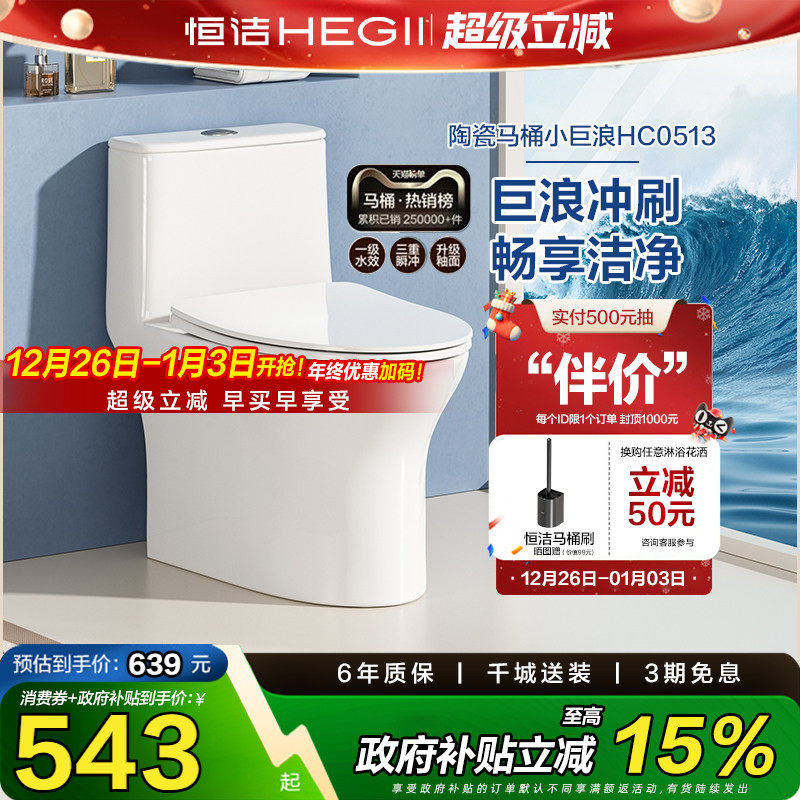【政府补贴15%】恒洁马桶防臭卫浴虹吸式大冲力陶瓷抽水坐便器503