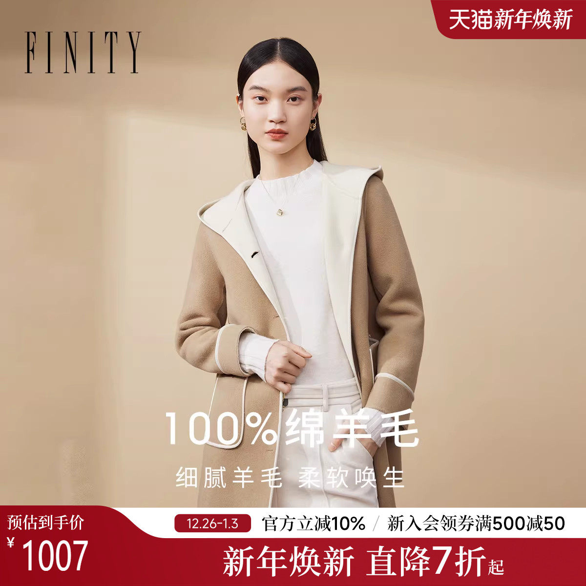 【纯羊毛】菲妮迪毛呢外套2025冬季新款连帽保暖双面呢羊毛大衣女
