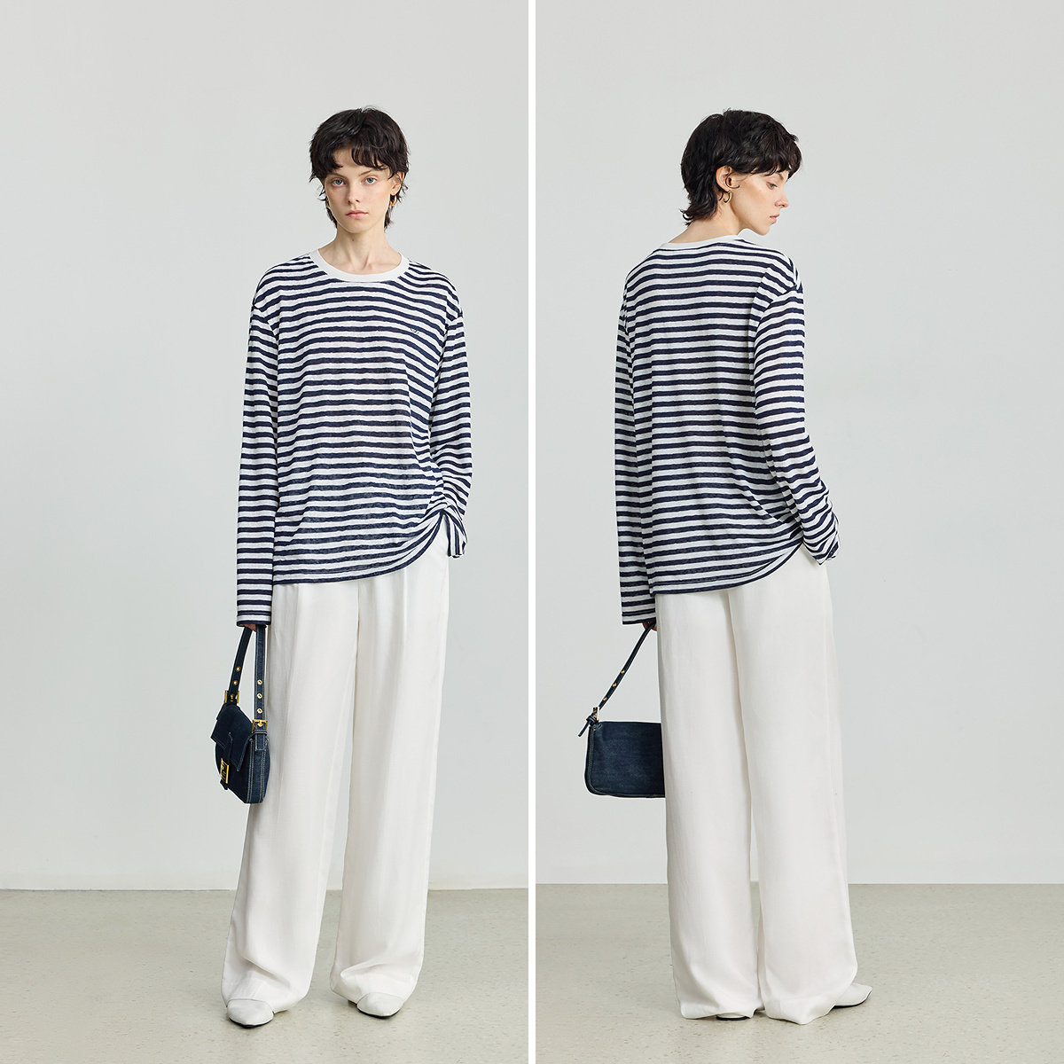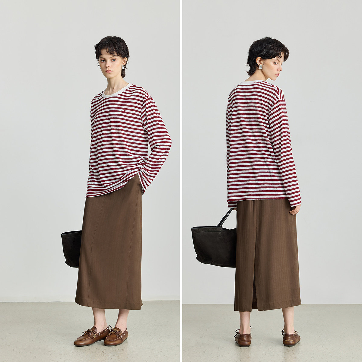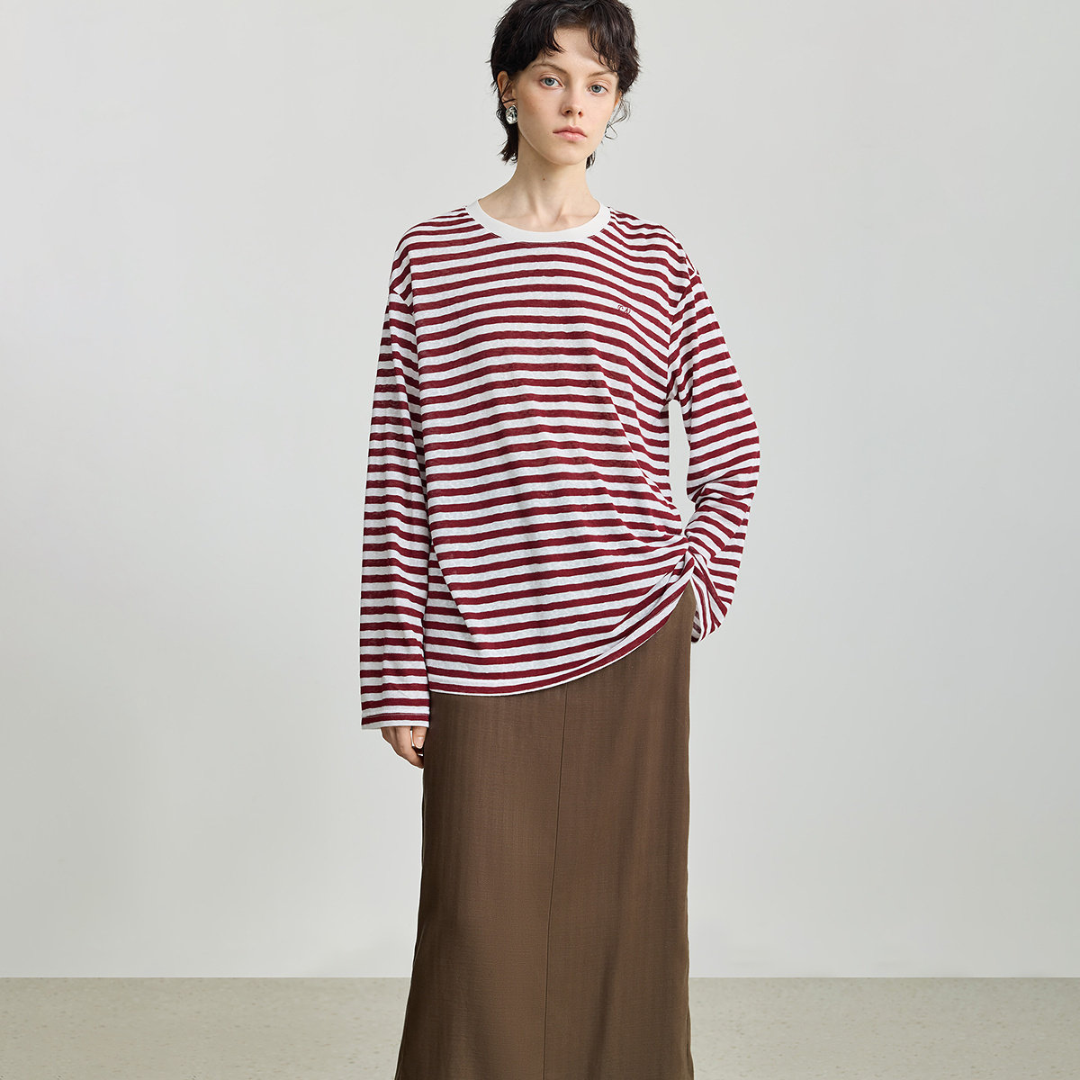 LILY2025冬新款简约撞色条纹圆领宽松休闲百搭通勤长袖T恤女上衣