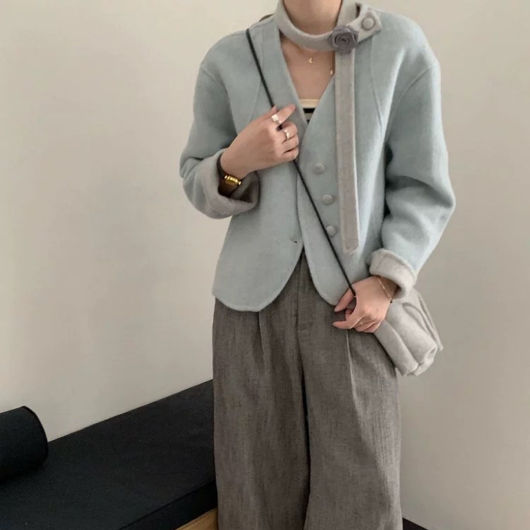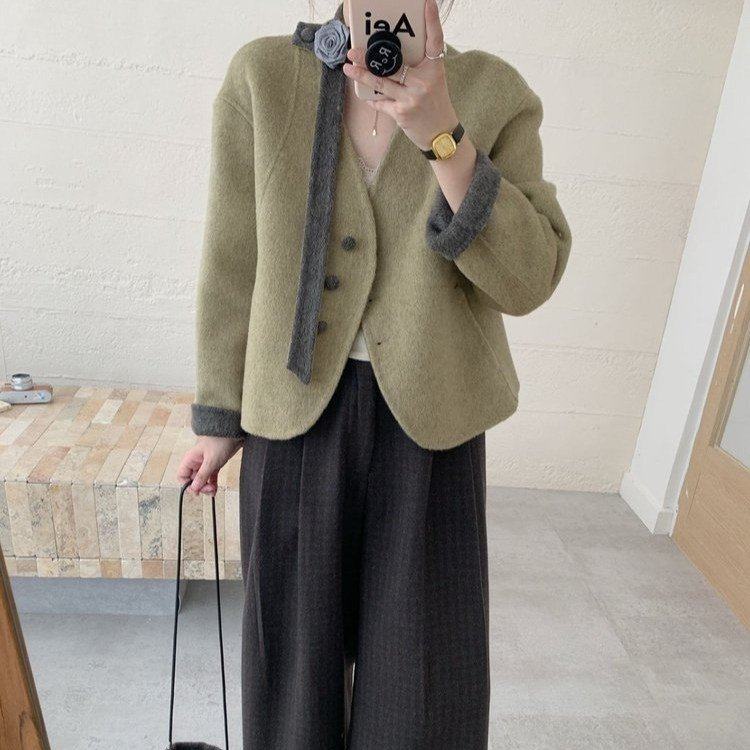 欧洲站2025秋冬新款V领飘带花朵双面羊绒大衣短款羊毛呢子外套潮