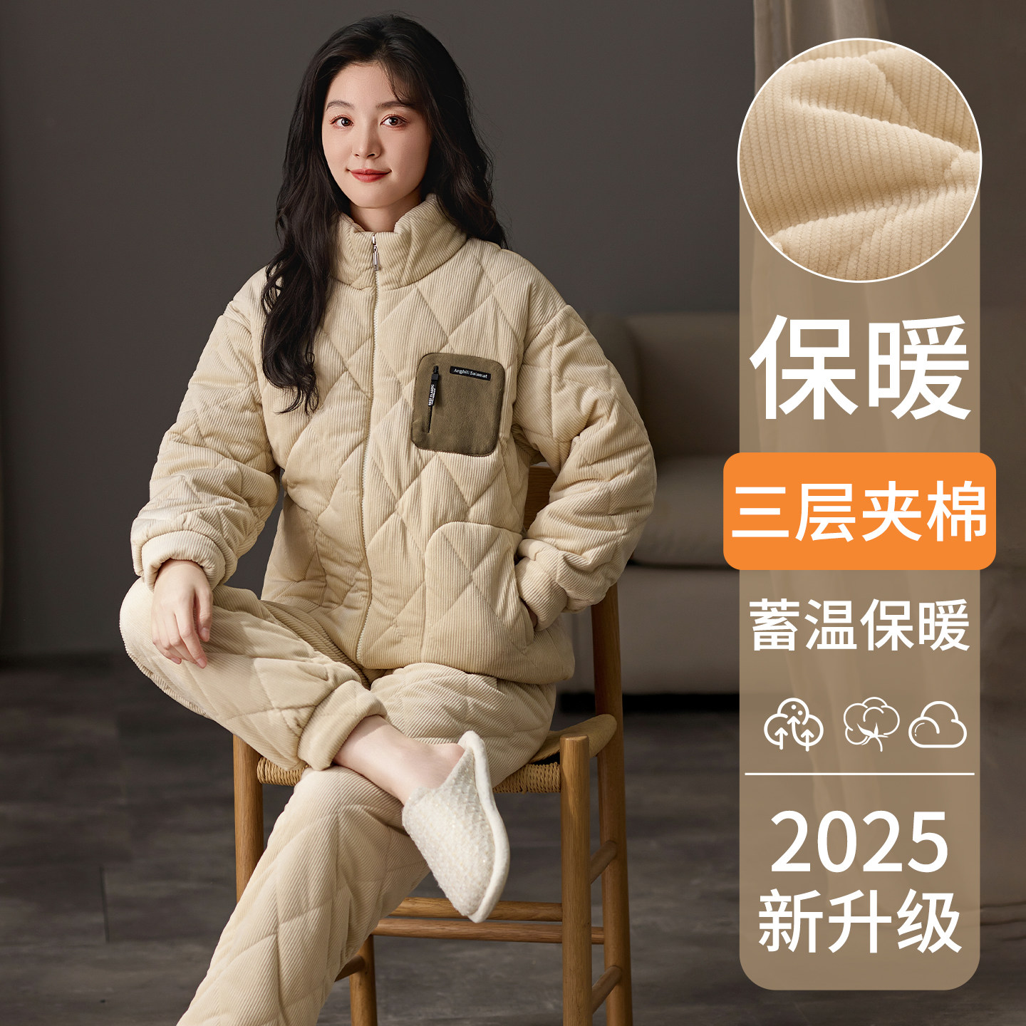 三层夹棉睡衣女秋冬季珊瑚绒加绒加厚2025新款保暖女士家居服套装