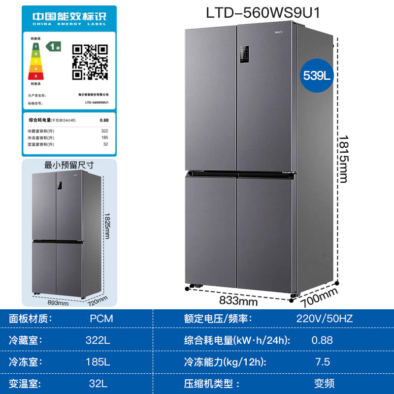 海尔出品统帅冰箱十字对开四门家用539L一级变频560官方旗舰正品