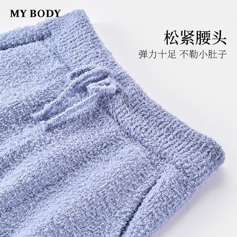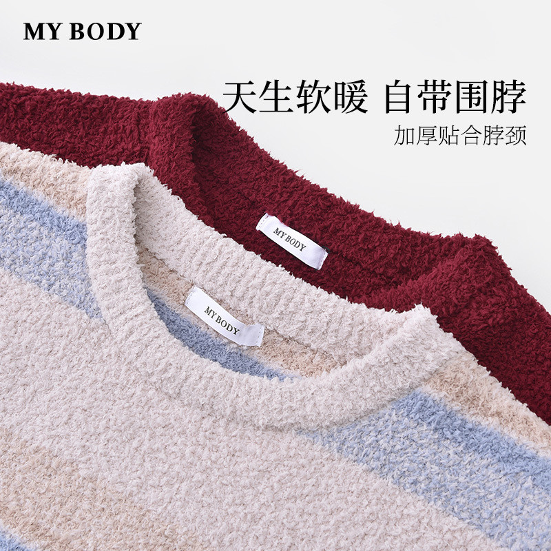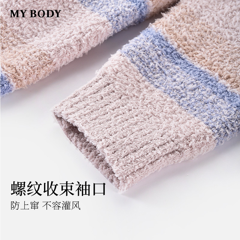 商场同款MYBODY冬季新款男士半边绒睡衣套装圆领条纹可外穿家居服